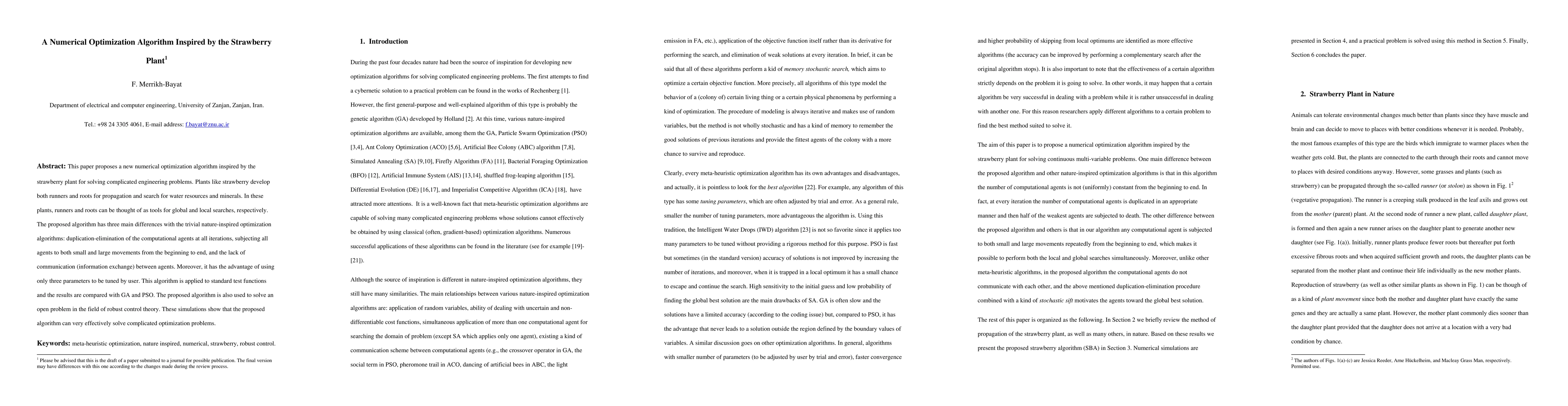 This paper introduces a new optimization algorithm inspired by the strawberry plant's propagation methods, emphasizing global and local search strategies. It features unique features like agent duplication elimination, varied movement scales, and no inter-agent communication, and is shown to outperform GA and PSO on test functions and a robust control problem.