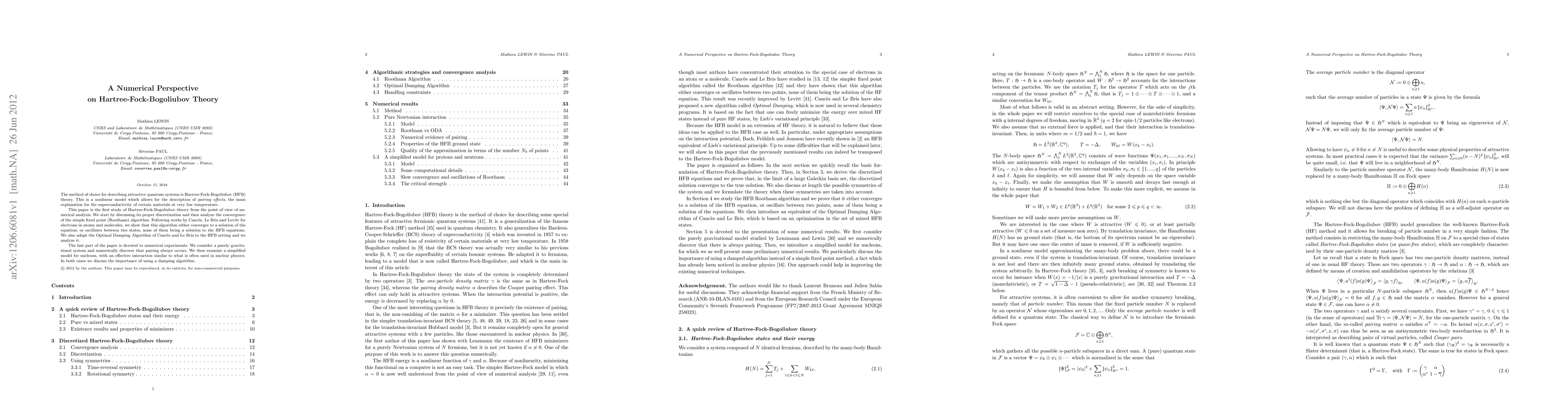 Researchers analyze Hartree-Fock-Bogoliubov theory using numerical methods, finding that a damping algorithm is crucial for convergence and discovering pairing in purely gravitational systems.