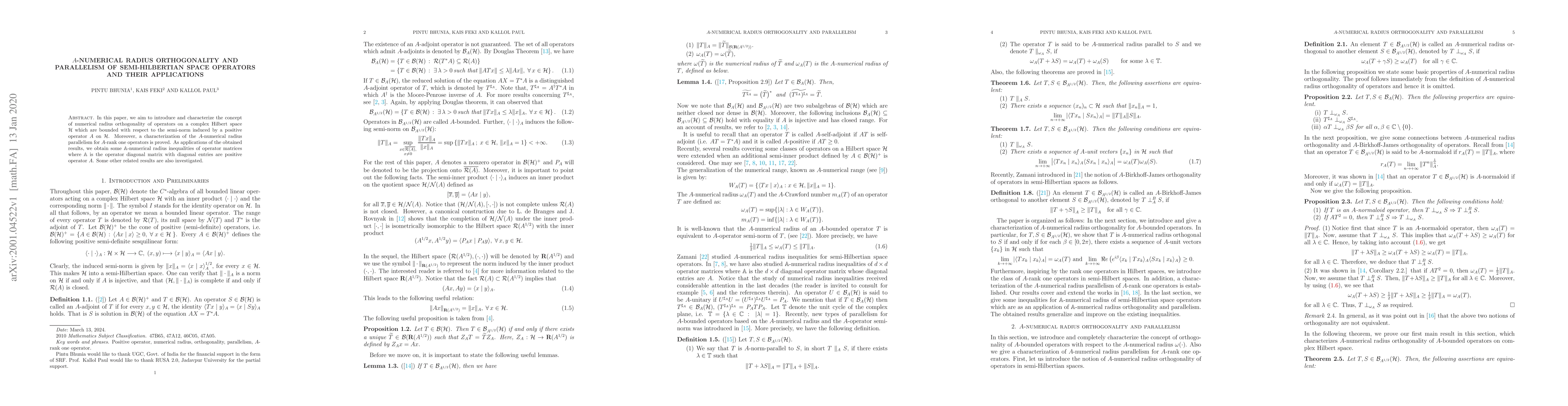 This paper explores the concept of $A$-numerical radius orthogonality of operators on a complex Hilbert space, introducing a new characterization for parallelism of semi-Hilbertian space operators with applications to operator matrices and inequalities.