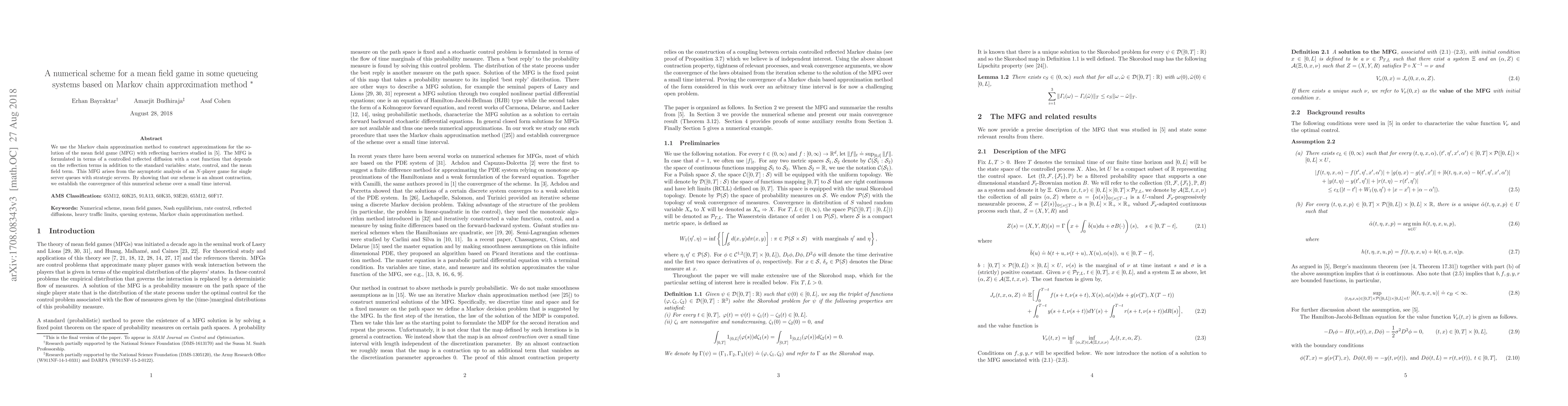 We use the Markov chain approximation method to construct approximations for the solution of the mean field game (MFG) with reflecting barriers studied in Bayraktar, Budhiraja, and Cohen (2017). The MFG is formulated in terms of a controlled reflected diffusion with a cost function that depends on the reflection terms in addition to the standard variables: state, control, and the mean field term. This MFG arises from the asymptotic analysis of an $N$-player game for single server queues with strategic servers. By showing that our scheme is an almost contraction, we establish the convergence of this numerical scheme over a small time interval.