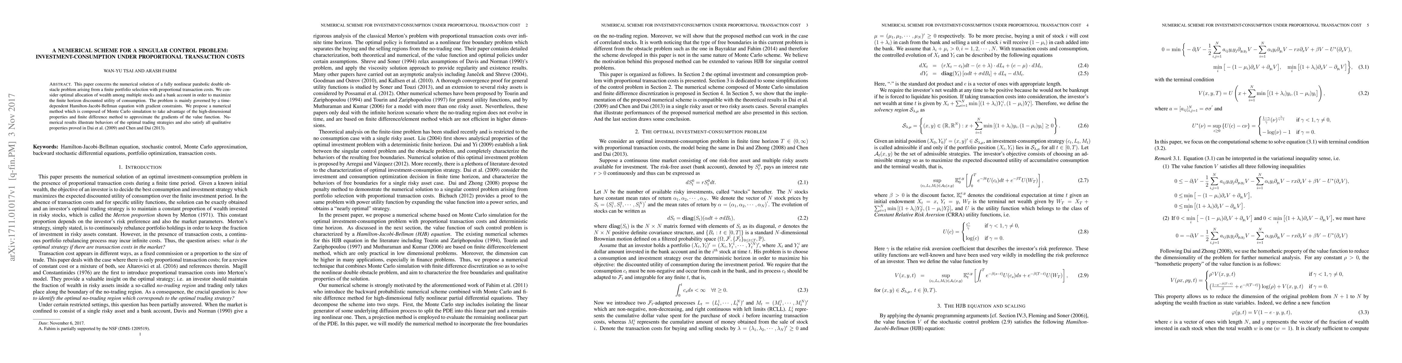 This paper proposes a numerical method to solve an investment-consumption problem with proportional transaction costs, using Monte Carlo simulation and finite difference methods to approximate the value function.