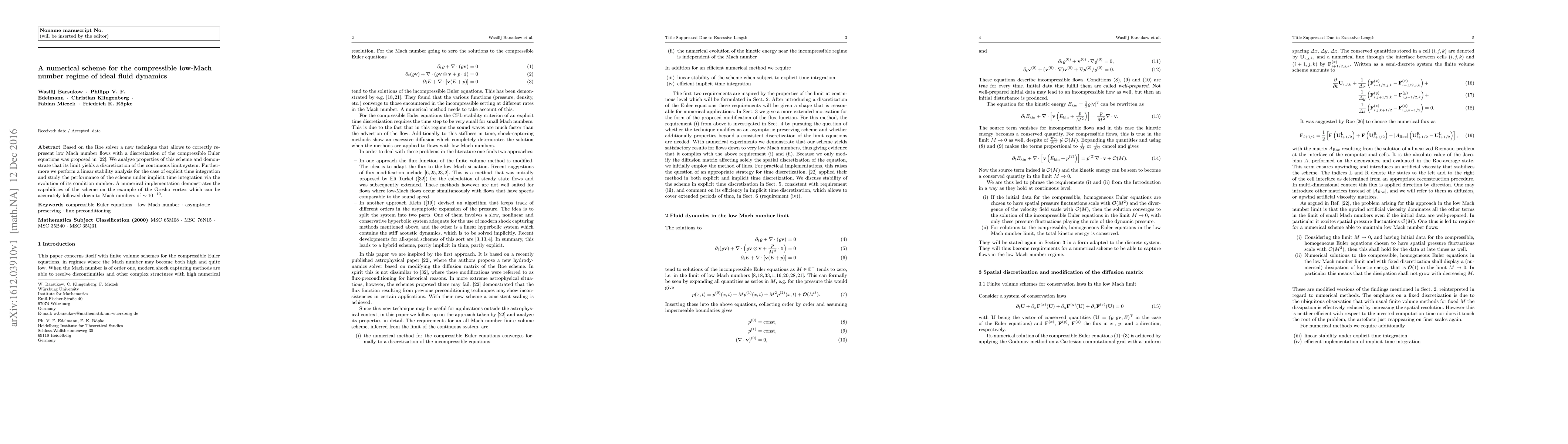 Based on the Roe solver a new technique that allows to correctly represent low Mach number flows with a discretization of the compressible Euler equations was proposed in Miczek et al.: New numerical solver for flows at various mach numbers. A&A 576, A50 (2015). We analyze properties of this scheme and demonstrate that its limit yields a discretization of the continuous limit system. Furthermore we perform a linear stability analysis for the case of explicit time integration and study the performance of the scheme under implicit time integration via the evolution of its condition number. A numerical implementation demonstrates the capabilities of the scheme on the example of the Gresho vortex which can be accurately followed down to Mach numbers of ~1e-10 .