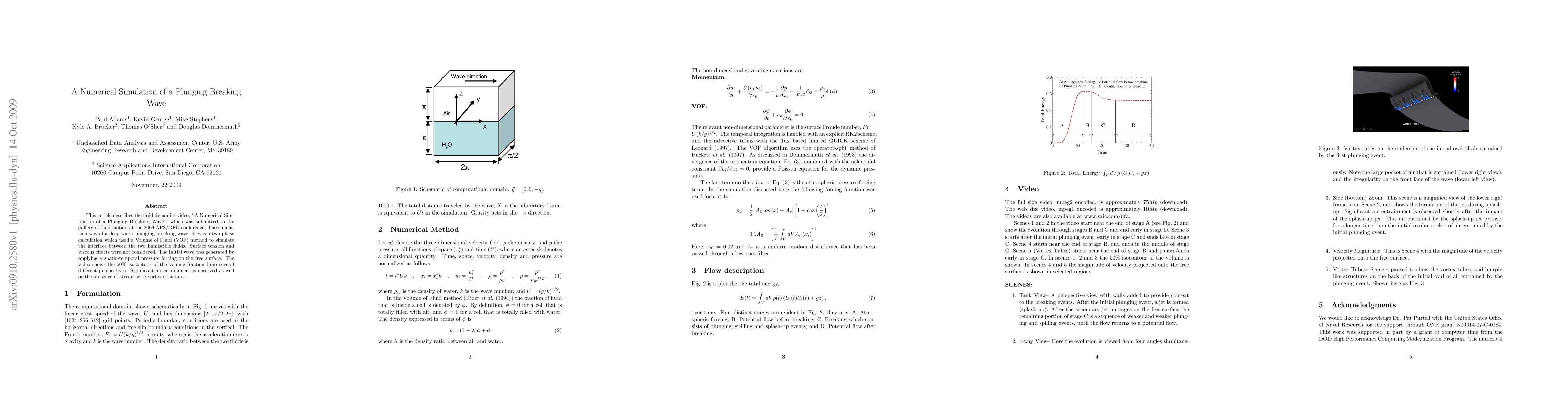 This paper presents a numerical simulation of a deep-water plunging breaking wave using a two-phase Volume of Fluid method, showcasing significant air entrainment and stream-wise vortex structures without considering surface tension and viscosity. The simulation was submitted to the 2009 APS/DFD conference fluid motion gallery.