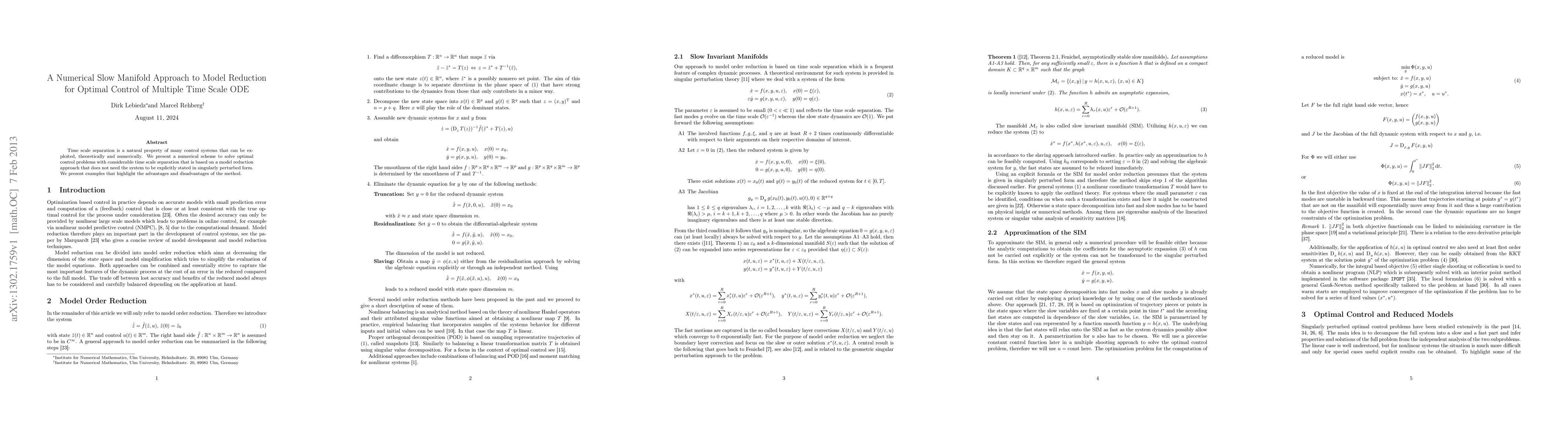 This paper proposes a numerical slow manifold approach for model reduction in optimal control problems with significant time scale separation, avoiding the need for singularly perturbed form. The method's effectiveness is demonstrated through examples highlighting its advantages and limitations.