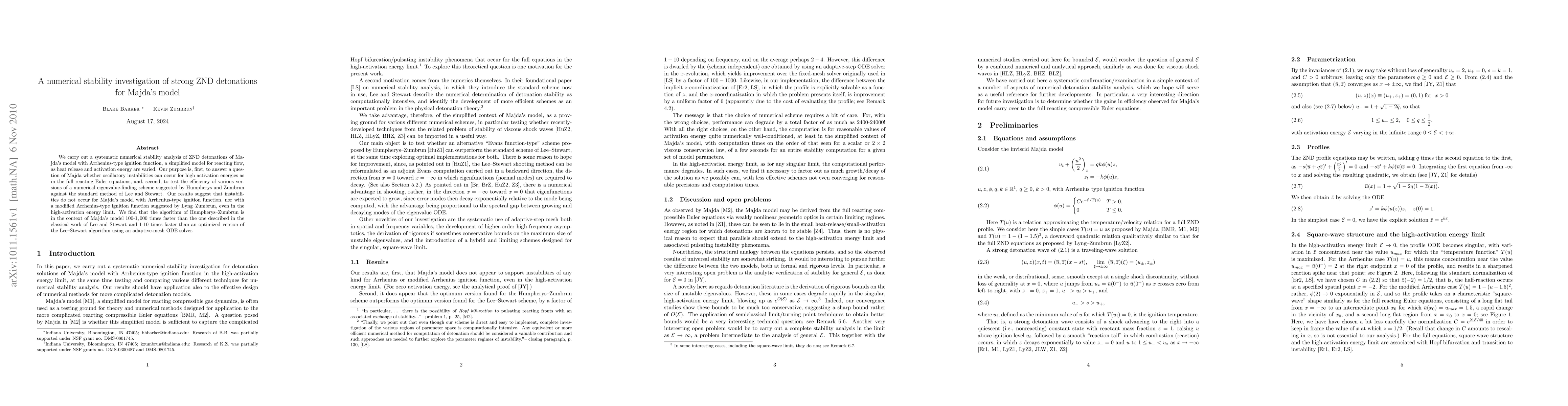 This paper investigates the numerical stability of strong ZND detonations for Majda's model with an Arrhenius-type ignition function, finding no oscillatory instabilities even at high activation energies. It also demonstrates that the Humpherys-Zumbrun eigenvalue-finding scheme is significantly faster than the Lee-Stewart method.