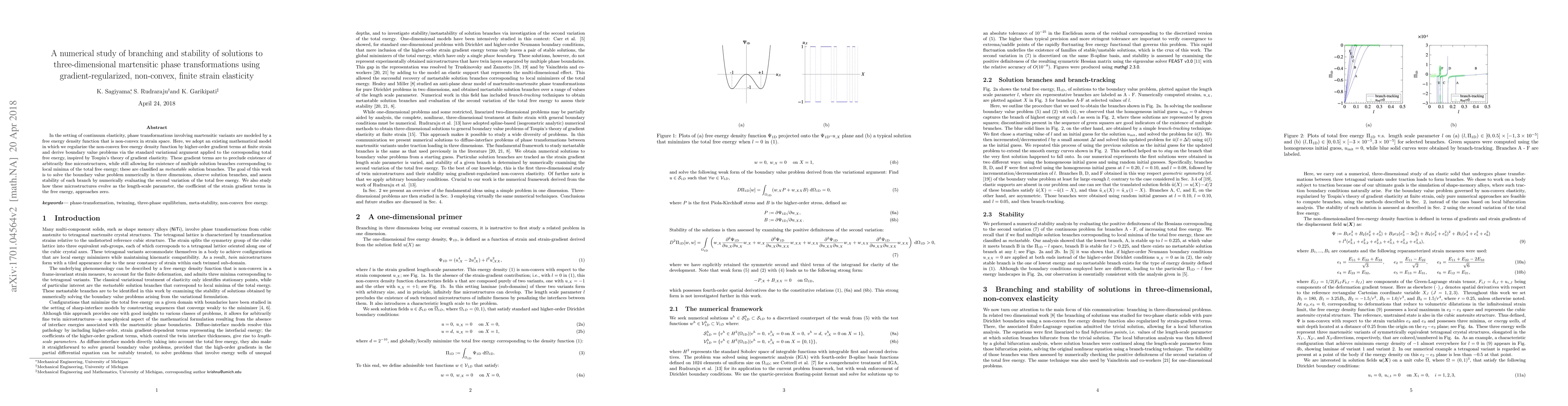 In the setting of continuum elasticity, phase transformations involving martensitic variants are modeled by a free energy density function that is non-convex in strain space. Here, we adopt an existing mathematical model in which we regularize the non-convex free energy density function by higher-order gradient terms at finite strain and derive boundary value problems via the standard variational argument applied to the corresponding total free energy, inspired by Toupin's theory of gradient elasticity. These gradient terms are to preclude existence of arbitrarily fine microstructures, while still allowing for existence of multiple solution branches corresponding to local minima of the total free energy; these are classified as metastable solution branches. The goal of this work is to solve the boundary value problem numerically in three dimensions, observe solution branches, and assess stability of each branch by numerically evaluating the second variation of the total free energy. We also study how these microstructures evolve as the length-scale parameter, the coefficient of the strain gradient terms in the free energy, approaches zero.