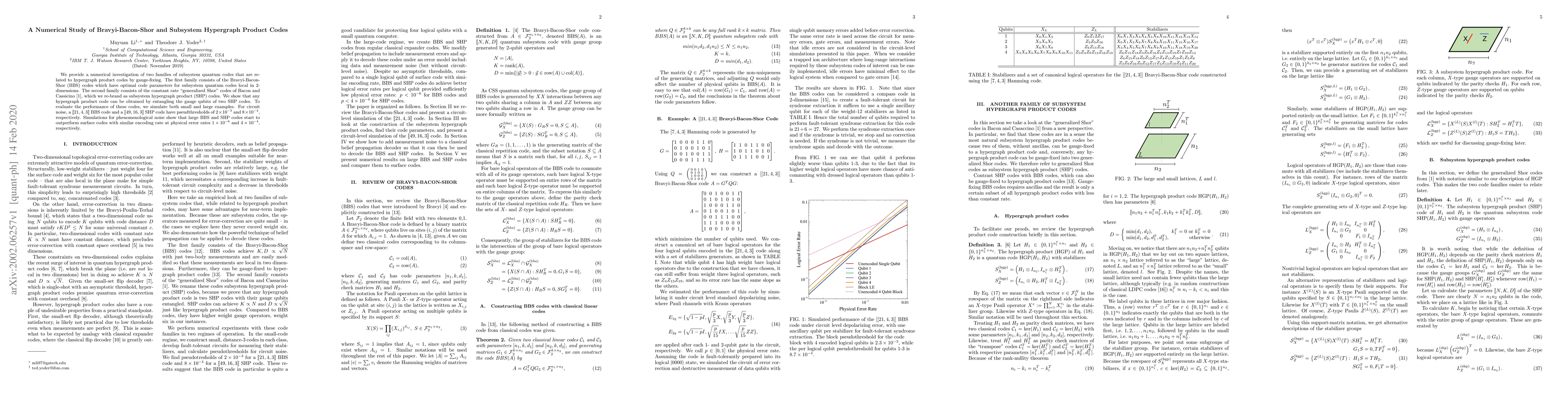 We provide a numerical investigation of two families of subsystem quantum codes that are related to hypergraph product codes by gauge-fixing. The first family consists of the Bravyi-Bacon-Shor (BBS) codes which have optimal code parameters for subsystem quantum codes local in 2-dimensions. The second family consists of the constant rate "generalized Shor" codes of Bacon and Cassicino \cite{bacon2006quantum}, which we re-brand as subsystem hypergraph product (SHP) codes. We show that any hypergraph product code can be obtained by entangling the gauge qubits of two SHP codes. To evaluate the performance of these codes, we simulate both small and large examples. For circuit noise, a $[[21,4,3]]$ BBS code and a $[[49,16,3]]$ SHP code have pseudthresholds of $2\times10^{-3}$ and $8\times10^{-4}$, respectively. Simulations for phenomenological noise show that large BBS and SHP codes start to outperform surface codes with similar encoding rate at physical error rates $1\times 10^{-6}$ and $4\times10^{-4}$, respectively.