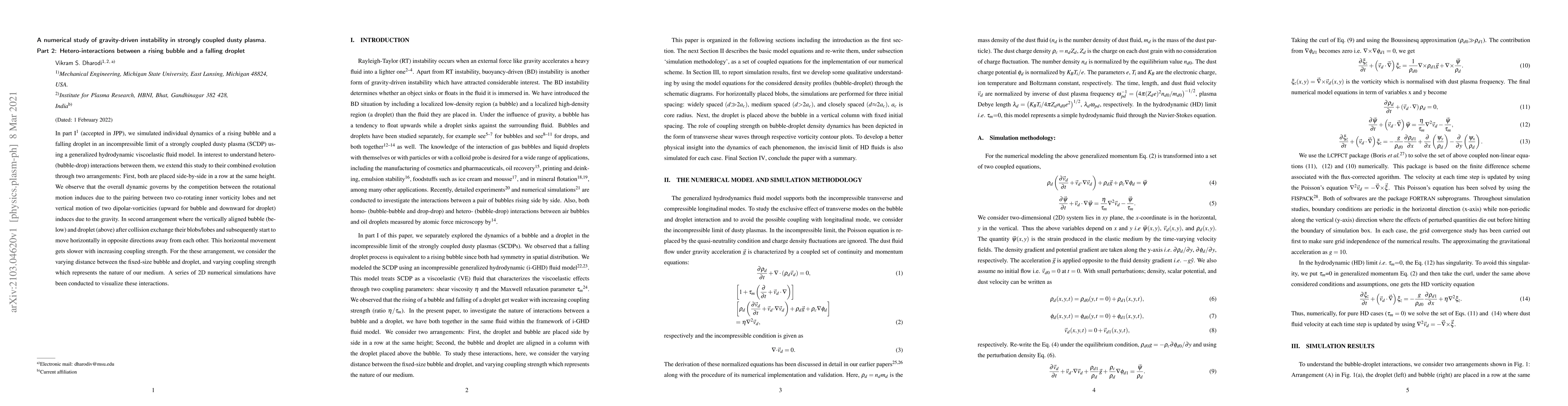In part I (arXiv:2006.12393) (accepted in JPP), we simulated individual dynamics of a rising bubble and a falling droplet in an incompressible limit of a strongly coupled dusty plasma (SCDP) using a generalized hydrodynamic viscoelastic fluid model. In interest to understand hetero- (bubble-drop) interactions between them, we extend this study to their combined evolution through two arrangements: First, both are placed side-by-side in a row at the same height. We observe that the overall dynamic governs by the competition between the rotational motion induces due to the pairing between two co-rotating inner vorticity lobes and net vertical motion of two dipolar-vorticities (upward for bubble and downward for droplet) induces due to the gravity. In second arrangement where the vertically aligned bubble (below) and droplet (above) after collision exchange their blobs/lobes and subsequently start to move horizontally in opposite directions away from each other. This horizontal movement gets slower with increasing coupling strength. For the these arrangement, we consider the varying distance between the fixed-size bubble and droplet, and varying coupling strength which represents the nature of our medium. A series of 2D numerical simulations have been conducted to visualize these interactions