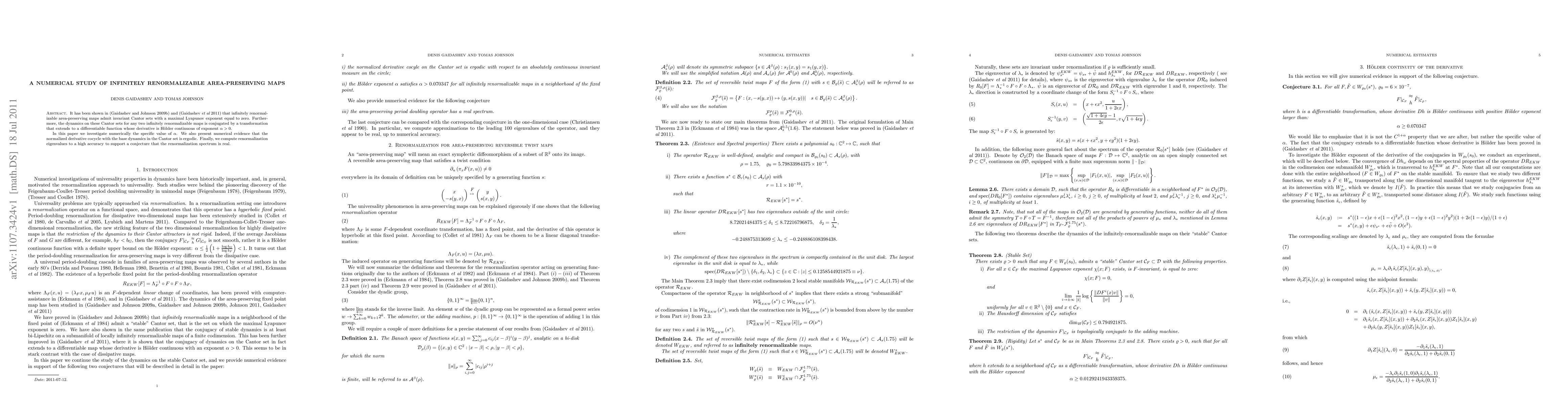 This paper numerically investigates the specific value of alpha in infinitely renormalizable area-preserving maps, showing the dynamics on invariant Cantor sets are conjugated by differentiable functions. It presents evidence that the normalized derivative cocycle is ergodic and computes renormalization eigenvalues to support the conjecture that the spectrum is real.