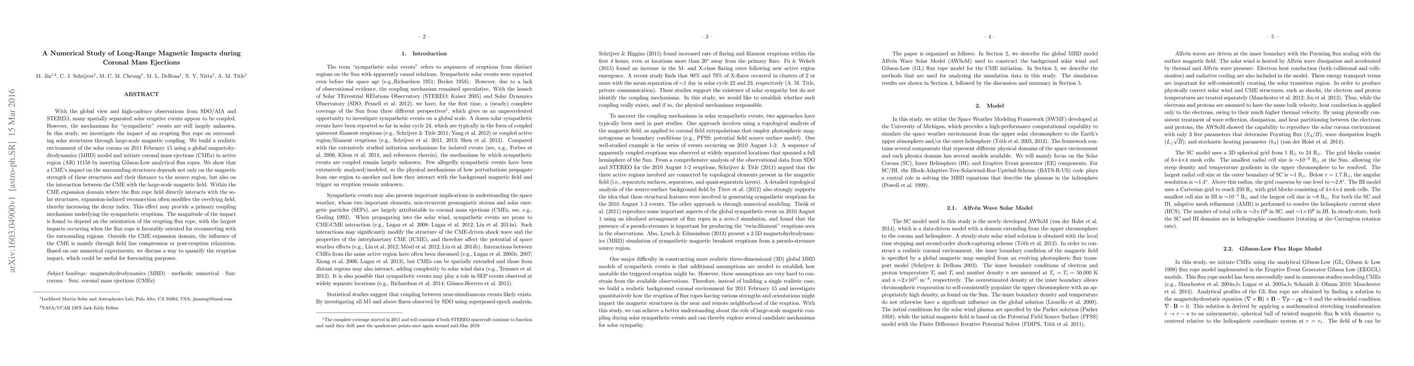 This paper investigates the long-range magnetic effects of coronal mass ejections (CMEs) on surrounding solar structures using a global magnetohydrodynamics model. The study finds that CME impacts depend on the magnetic field strength and distance from the source, as well as the interaction with the large-scale magnetic field, potentially explaining sympathetic eruptions.