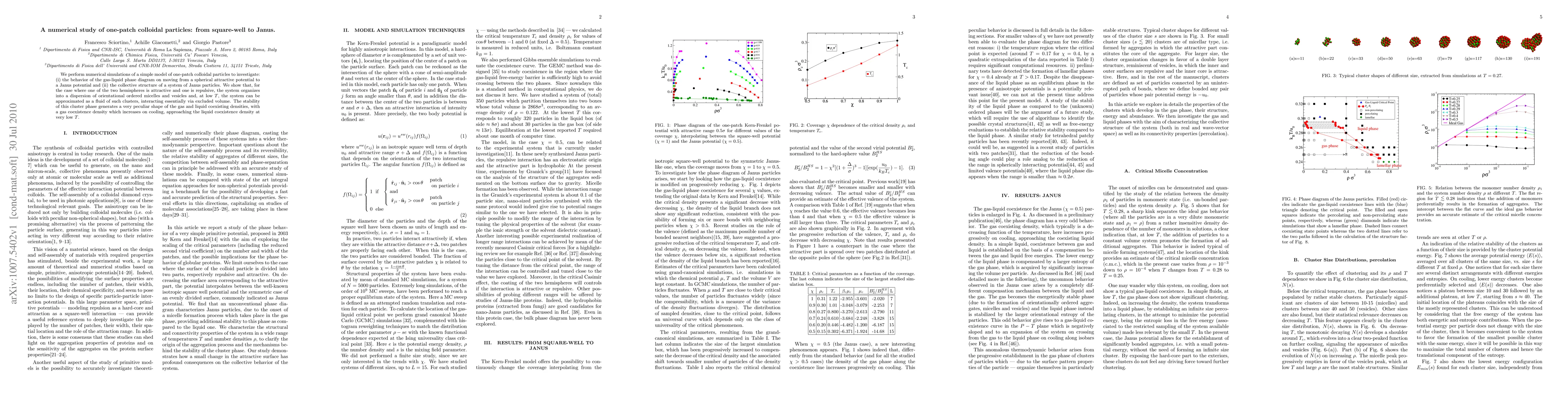 We perform numerical simulations of a simple model of one-patch colloidal particles to investigate: (i) the behavior of the gas-liquid phase diagram on moving from a spherical attractive potential to a Janus potential and (ii) the collective structure of a system of Janus particles. We show that, for the case where one of the two hemispheres is attractive and one is repulsive, the system organizes into a dispersion of orientational ordered micelles and vesicles and, at low $T$, the system can be approximated as a fluid of such clusters, interacting essentially via excluded volume. The stability of this cluster phase generates a very peculiar shape of the gas and liquid coexisting densities, with a gas coexistence density which increases on cooling, approaching the liquid coexistence density at very low $T$.