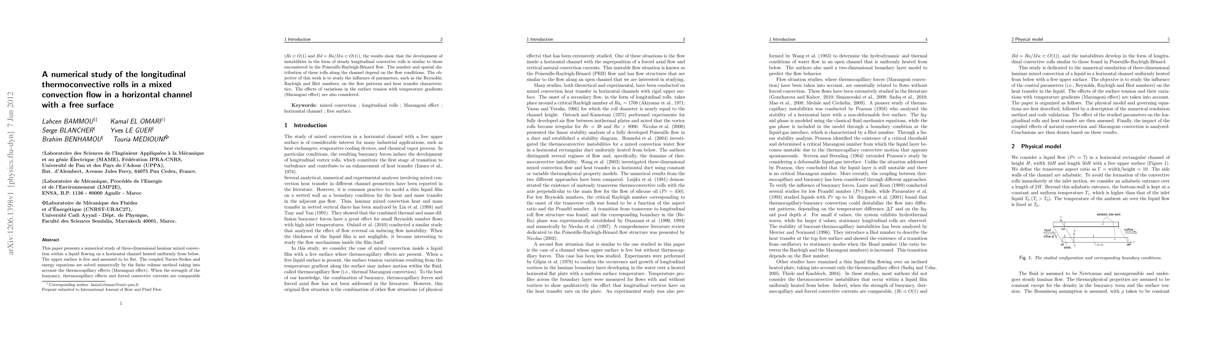 This paper presents a numerical study of three-dimensional laminar mixed convection within a liquid flowing on a horizontal channel heated uniformly from below. The upper surface is free and assumed to be flat. The coupled Navier-Stokes and energy equations are solved numerically by the finite volume method taking into account the thermocapillary effects (Marangoni effect). When the strength of the buoyancy, thermocapillary effects and forced convective currents are comparable $(Ri\backsimeq O(1)$ and $Bd=Ra/Ma \backsimeq O(1))$, the results show that the development of instabilities in the form of steady longitudinal convective rolls is similar to those encountered in the Poiseuille-Rayleigh-B\'enard flow. The number and spatial distribution of these rolls along the channel depend on the flow conditions. The objective of this work is to study the influence of parameters, such as the Reynolds, Rayleigh and Biot numbers, on the flow patterns and heat transfer characteristics. The effects of variations in the surface tension with temperature gradients (Marangoni effect) are also considered.