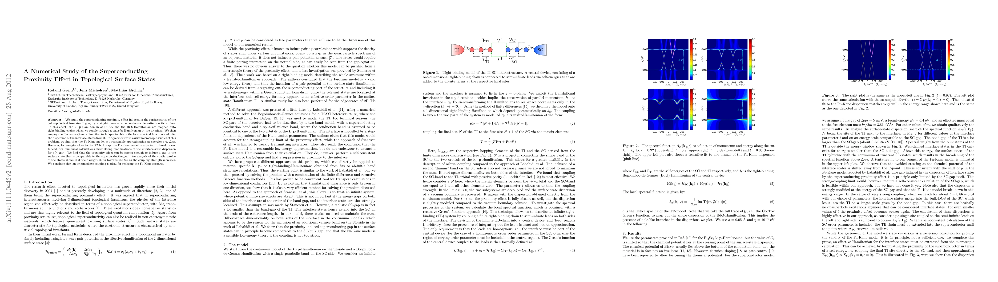 We study the superconducting proximity effect induced in the surface states of the 3-d topological insulator Bi$_2$Se$_3$ by a singlet, s-wave superconductor deposited on its surface. To this effect, the $\mathbf{k}\cdot\mathbf{p}$-Hamiltonian of Bi$_2$Se$_3$ and the BCS-Hamiltonian are mapped onto tight-binding chains which we couple through a transfer-Hamiltonian at the interface. We then employ the Recursive Green's Function technique to obtain the local spectral function and infer the dispersion of the interface-states from it. In agreement with earlier microscopic studies of this problem, we find that the Fu-Kane model is a reasonable approximation at energies $\epsilon\ll \Delta_{\rm SC}$. However, for energies close to the SC bulk gap, the Fu-Kane model is expected to break down. Indeed, our numerical calculations show strong modifications of the interface-state dispersion for $\epsilon \gtrsim \Delta_{\rm SC} $. We find that the proximity effect can be strong enough to induce a gap in the surface state that is comparable to the superconducting gap. An analysis of the spatial profile of the states shows that their weight shifts towards the SC as the coupling strength increases. We conclude that an intermediate coupling is ideal for realising the Fu-Kane scenario.