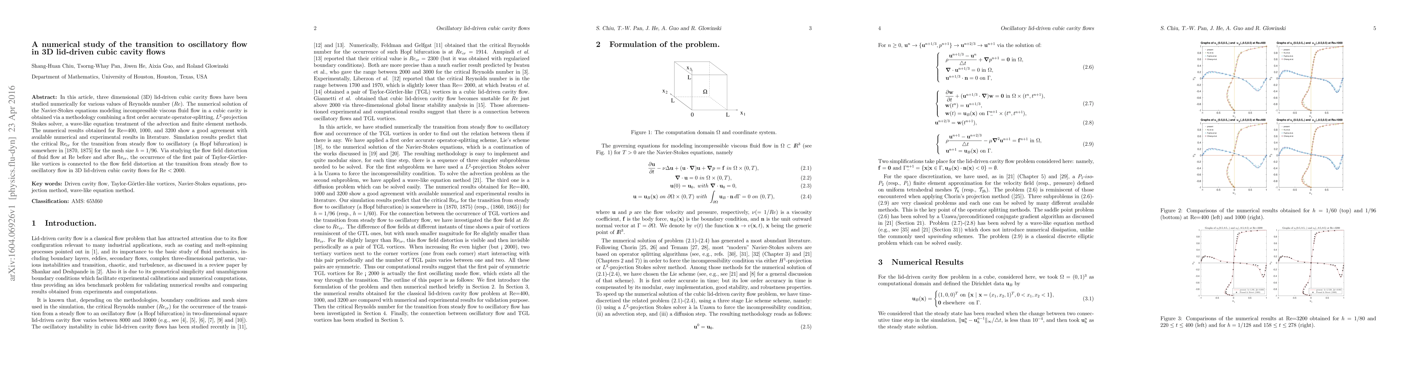 This paper numerically investigates the transition to oscillatory flow in 3D lid-driven cubic cavity flows using a combination of operator-splitting, $L^2$-projection, and finite element methods. The study finds that the critical Reynolds number for the transition is in the range [1870, 1875], and identifies the formation of Taylor-Görtler-like vortices at this transition.