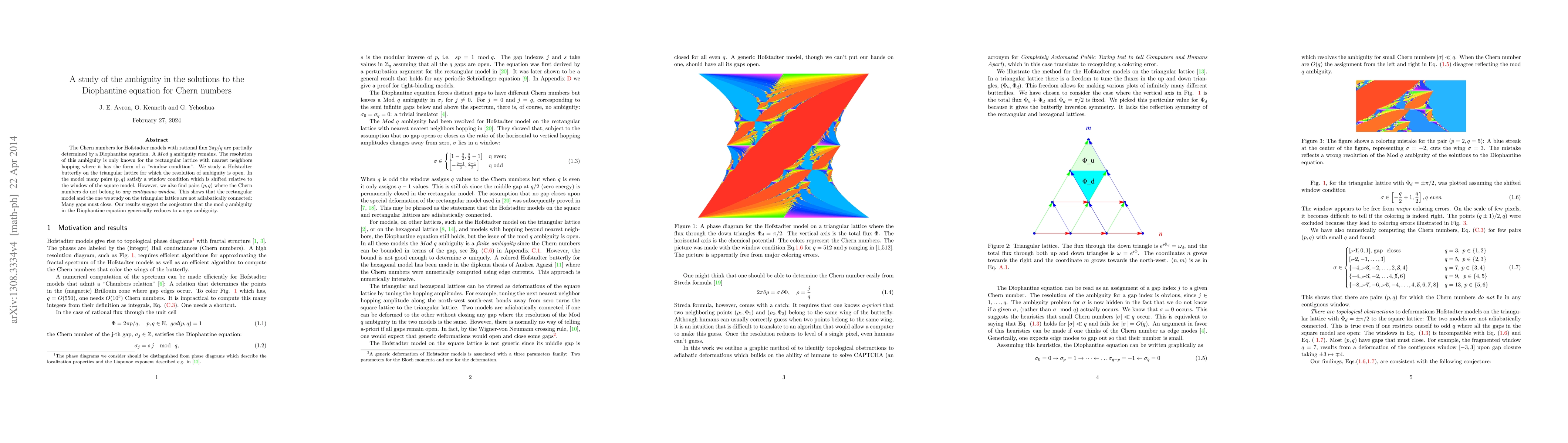 The Chern numbers for Hofstadter models with rational flux 2*pi*p/q are partially determined by a Diophantine equation. A Mod q ambiguity remains. The resolution of this ambiguity is only known for the rectangular lattice with nearest neighbors hopping where it has the form of a "window condition". We study a Hofstadter butterfly on the triangular lattice for which the resolution of ambiguity is open. In the model many pairs (p,q) satisfy a window condition which is shifted relative to the window of the square model. However, we also find pairs (p,q) where the Chern numbers do not belong to any contiguous window. This shows that the rectangular model and the one we study on the triangular lattice are not adiabatically connected: Many gaps must close. Our results suggest the conjecture that the mod q ambiguity in the Diophantine equation generically reduces to a sign ambiguity.
