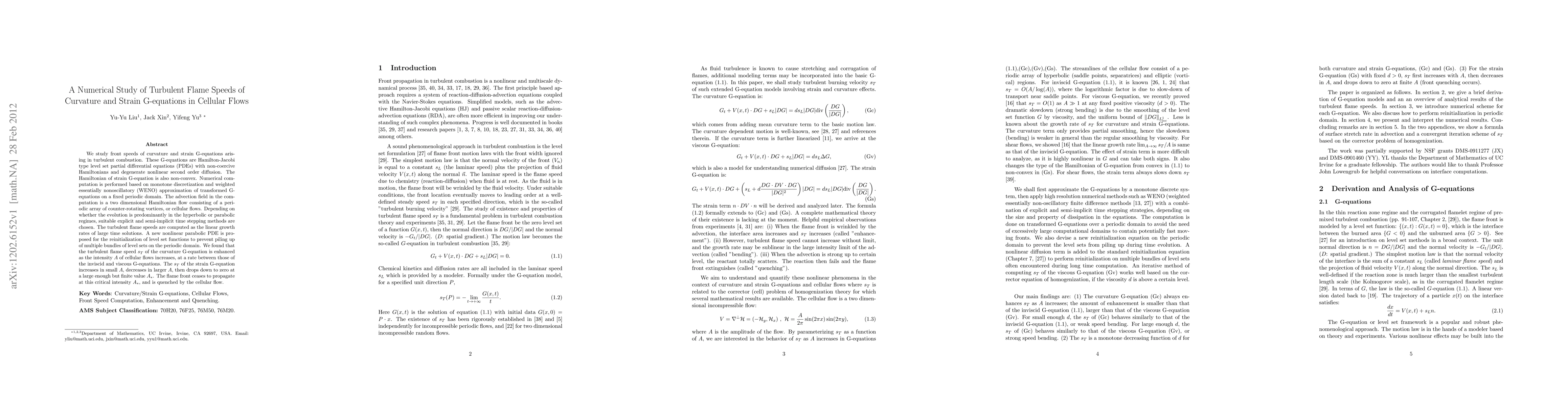 We study front speeds of curvature and strain G-equations arising in turbulent combustion. These G-equations are Hamilton-Jacobi type level set partial differential equations (PDEs) with non-coercive Hamiltonians and degenerate nonlinear second order diffusion. The Hamiltonian of strain G-equation is also non-convex. Numerical computation is performed based on monotone discretization and weighted essentially nonoscillatory (WENO) approximation of transformed G-equations on a fixed periodic domain. The advection field in the computation is a two dimensional Hamiltonian flow consisting of a periodic array of counter-rotating vortices, or cellular flows. Depending on whether the evolution is predominantly in the hyperbolic or parabolic regimes, suitable explicit and semi-implicit time stepping methods are chosen. The turbulent flame speeds are computed as the linear growth rates of large time solutions. A new nonlinear parabolic PDE is proposed for the reinitialization of level set functions to prevent piling up of multiple bundles of level sets on the periodic domain. We found that the turbulent flame speed $s_T$ of the curvature G-equation is enhanced as the intensity $A$ of cellular flows increases, at a rate between those of the inviscid and viscous G-equations. The $s_T$ of the strain G-equation increases in small $A$, decreases in larger $A$, then drops down to zero at a large enough but finite value $A_{*}$. The flame front ceases to propagate at this critical intensity $A_*$, and is quenched by the cellular flow.
