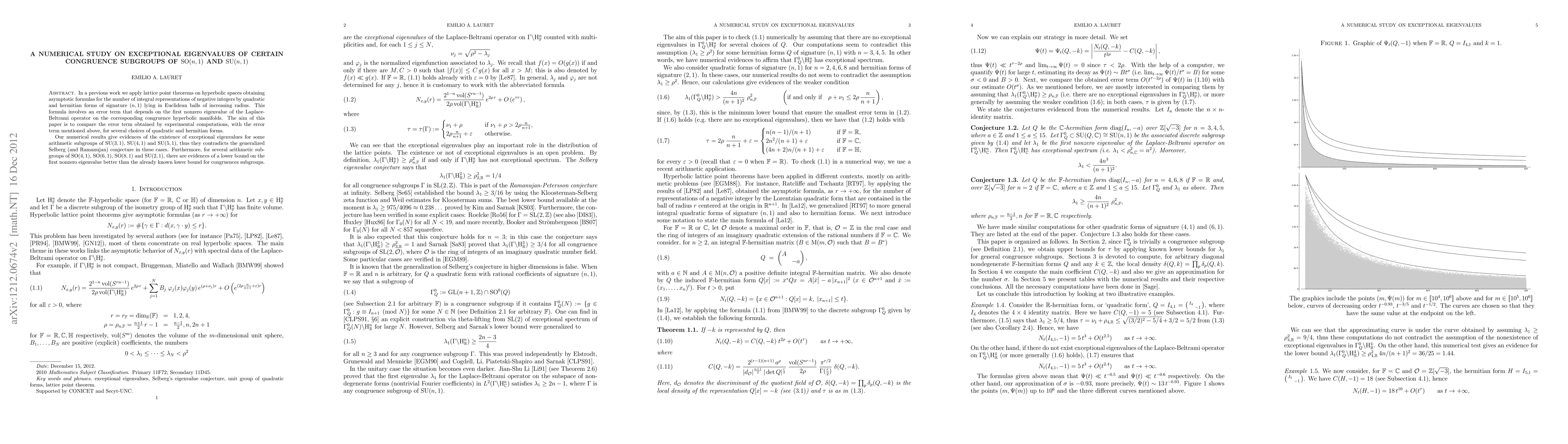 In a previous work we apply lattice point theorems on hyperbolic spaces obtaining asymptotic formulas for the number of integral representations of negative integers by quadratic and hermitian forms of signature (n,1) lying in Euclidean balls of increasing radius. This formula involves an error term that depends on the first nonzero eigenvalue of the Laplace-Beltrami operator on the corresponding congruence hyperbolic manifolds. The aim of this paper is to compare the error term obtained by experimental computations, with the error term mentioned above, for several choices of quadratic and hermitian forms. Our numerical results give evidences of the existence of exceptional eigenvalues for some arithmetic subgroups of SU(3,1), SU(4,1) and SU(5,1), thus they contradicts the generalized Selberg (and Ramanujan) conjecture in these cases. Furthermore, for several arithmetic subgroups of SO(4,1), SO(6,1), SO(8,1) and SU(2,1), there are evidences of a lower bound on the first nonzero eigenvalue better than the already known lower bound for congruences subgroups.
