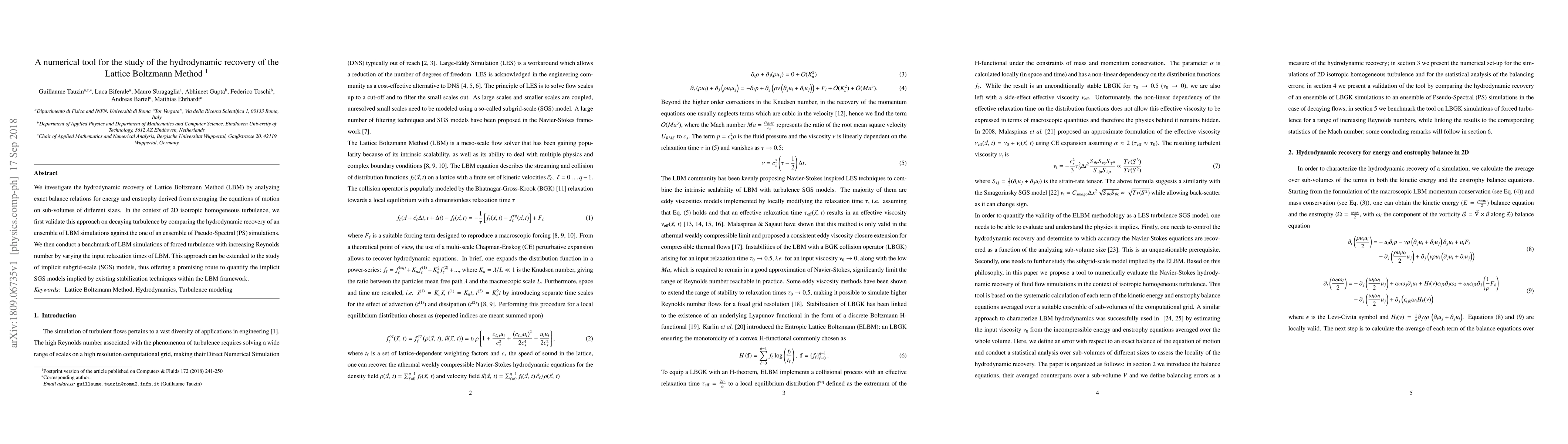 We investigate the hydrodynamic recovery of Lattice Boltzmann Method (LBM) by analyzing exact balance relations for energy and enstrophy derived from averaging the equations of motion on sub-volumes of different sizes. In the context of 2D isotropic homogeneous turbulence, we first validate this approach on decaying turbulence by comparing the hydrodynamic recovery of an ensemble of LBM simulations against the one of an ensemble of Pseudo-Spectral (PS) simulations. We then conduct a benchmark of LBM simulations of forced turbulence with increasing Reynolds number by varying the input relaxation times of LBM. This approach can be extended to the study of implicit subgrid-scale (SGS) models, thus offering a promising route to quantify the implicit SGS models implied by existing stabilization techniques within the LBM framework.
