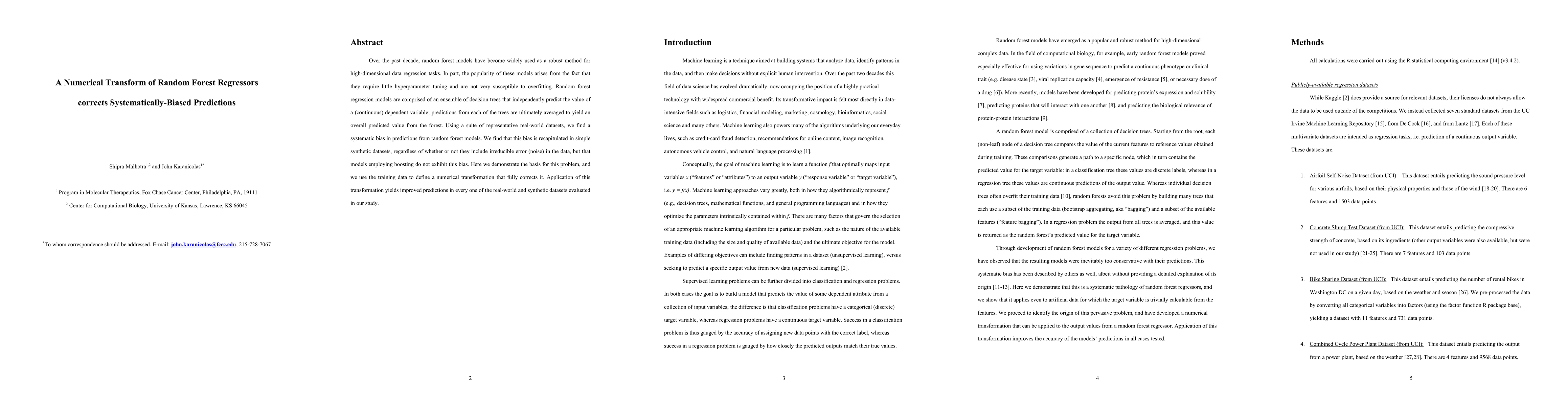 This paper identifies a systematic bias in random forest regression predictions and proposes a numerical transformation to correct it. The transformation, derived from training data, improves prediction accuracy across various real-world and synthetic datasets without affecting boosting models.