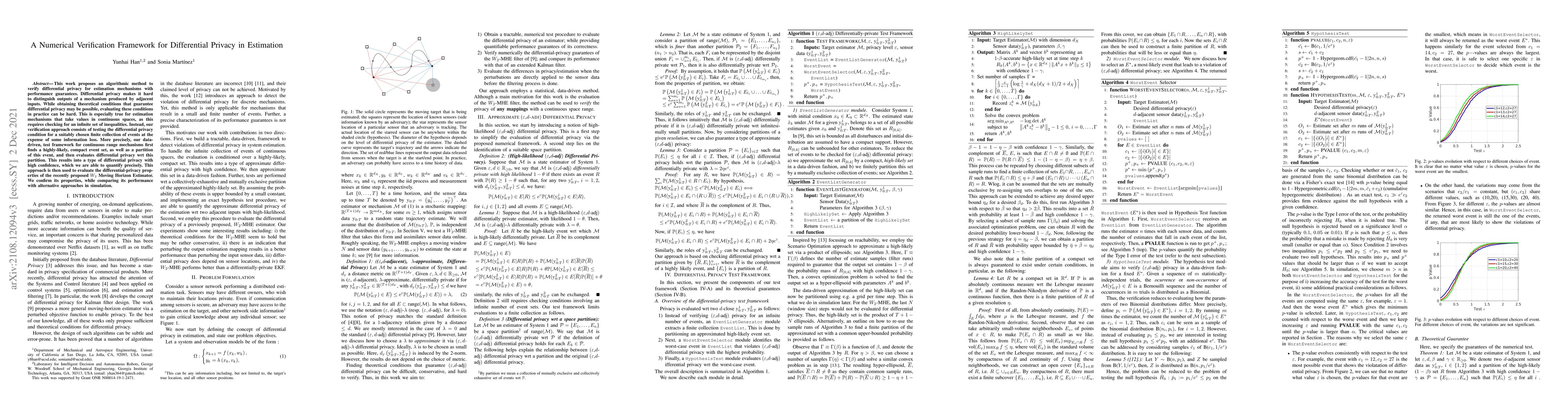 This work proposes an algorithmic method to verify differential privacy for estimation mechanisms with performance guarantees. Differential privacy makes it hard to distinguish outputs of a mechanism produced by adjacent inputs. While obtaining theoretical conditions that guarantee differential privacy may be possible, evaluating these conditions in practice can be hard. This is especially true for estimation mechanisms that take values in continuous spaces, as this requires checking for an infinite set of inequalities. Instead, our verification approach consists of testing the differential privacy condition for a suitably chosen finite collection of events at the expense of some information loss. More precisely, our data-driven, test framework for continuous range mechanisms first finds a highly-likely, compact event set, as well as a partition of this event, and then evaluates differential privacy wrt this partition. This results into a type of differential privacy with high confidence, which we are able to quantify precisely. This approach is then used to evaluate the differential-privacy properties of the recently proposed $W_2$ Moving Horizon Estimator. We confirm its properties, while comparing its performance with alternative approaches in simulation.