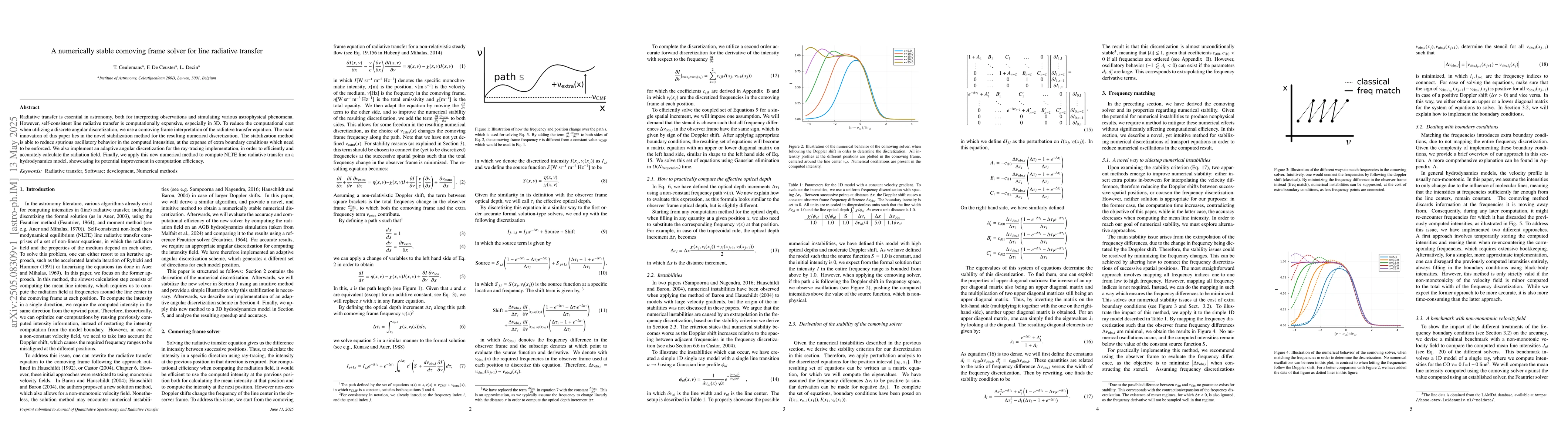 The paper presents a numerically stable comoving frame solver for line radiative transfer, incorporating an adaptive angular discretization and a novel stabilization method.