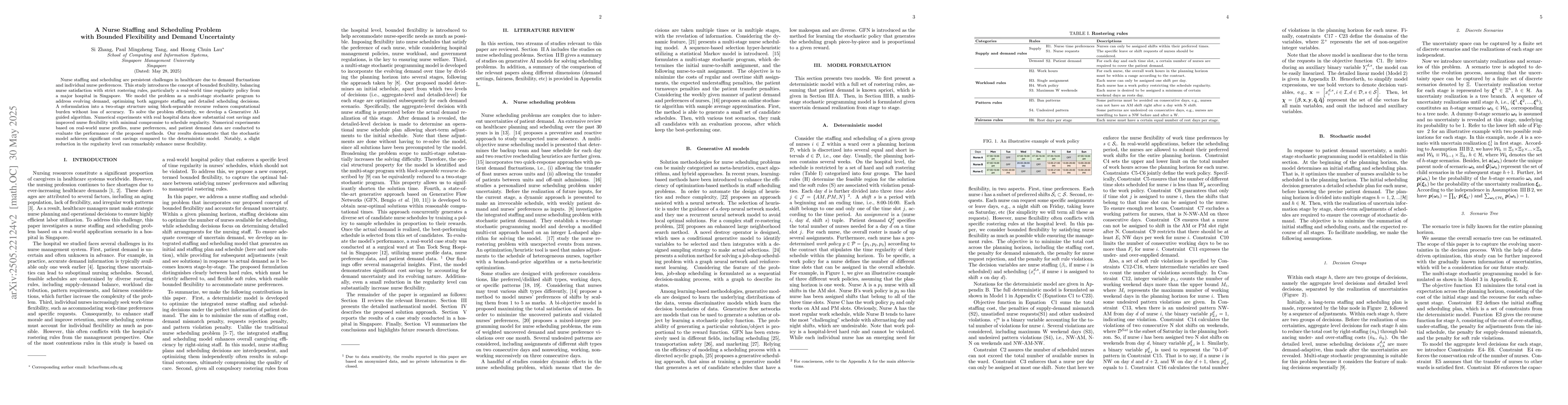 The paper introduces a two-stage stochastic programming reformulation and a Generative AI-guided algorithm for efficient solution of the nurse staffing and scheduling problem with bounded flexibility and demand uncertainty.