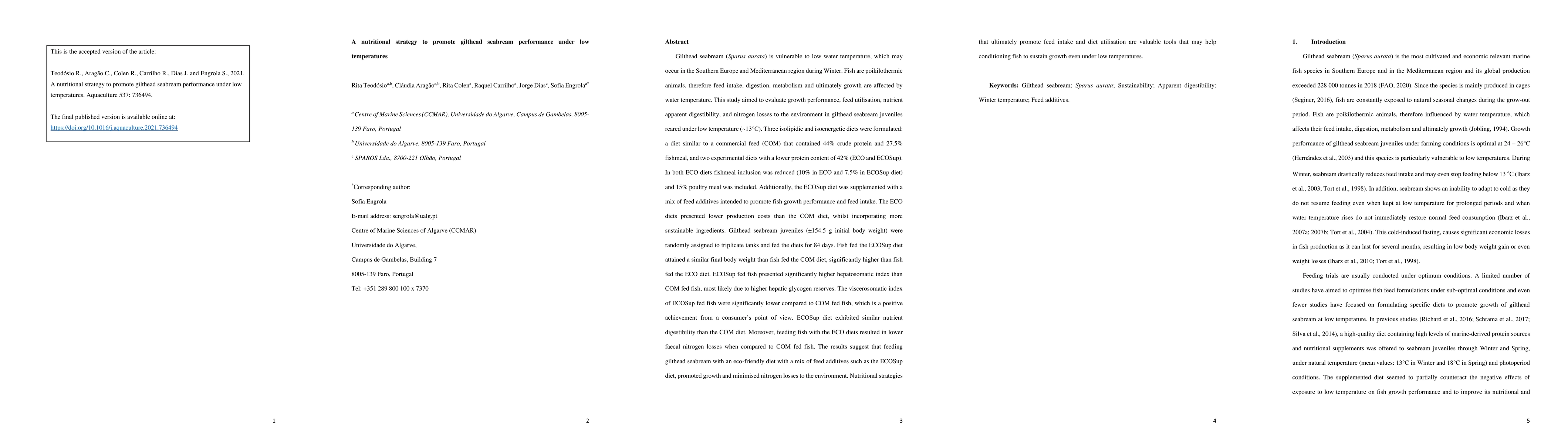 Gilthead seabream (Sparus aurata) is vulnerable to low water temperature, which may occur in the Southern Europe and Mediterranean region during Winter. Fish are poikilothermic animals, so feed intake, digestion, metabolism and ultimately growth are affected by water temperature. This study aimed to evaluate growth performance, feed utilisation, nutrient apparent digestibility, and N losses to the environment in seabream juveniles reared under low temperature (13 degrees Celsius). Three isolipid and isoenergetic diets were formulated: a commercial-like diet (COM) with 44% crude protein and 27.5% fishmeal; and 2 diets with 42% CP (ECO and ECOSup), reduced FM inclusion, and 15% poultry meal. ECOSup diet was supplemented with a mix of feed additives intended to promote fish growth and feed intake. The ECO diets presented lower production costs than the COM diet and included more sustainable ingredients. Seabream juveniles (154.5 g) were randomly assigned to triplicate tanks and fed the diets for 84 days. Fish fed the ECOSup and COM diets attained a similar final body weight. ECOSup fed fish presented significantly higher HSI than COM fed fish, probably due to higher hepatic glycogen reserves. The VSI of ECOSup fed fish were significantly lower compared to COM fed fish, which is a positive achievement from a consumer point of view. Nutrient digestibility was similar in ECOSup and COM diets. Feeding fish with the ECO diets resulted in lower faecal N losses when compared to COM fed fish. Feeding seabream with an eco-friendly diet with a mix of feed additives promoted growth, improved fish nutritional status and minimised N losses to the environment whilst lowering production costs. Nutritional strategies that ultimately promote feed intake and diet utilisation are valuable tools that may help conditioning fish to sustain growth even under adverse conditions.