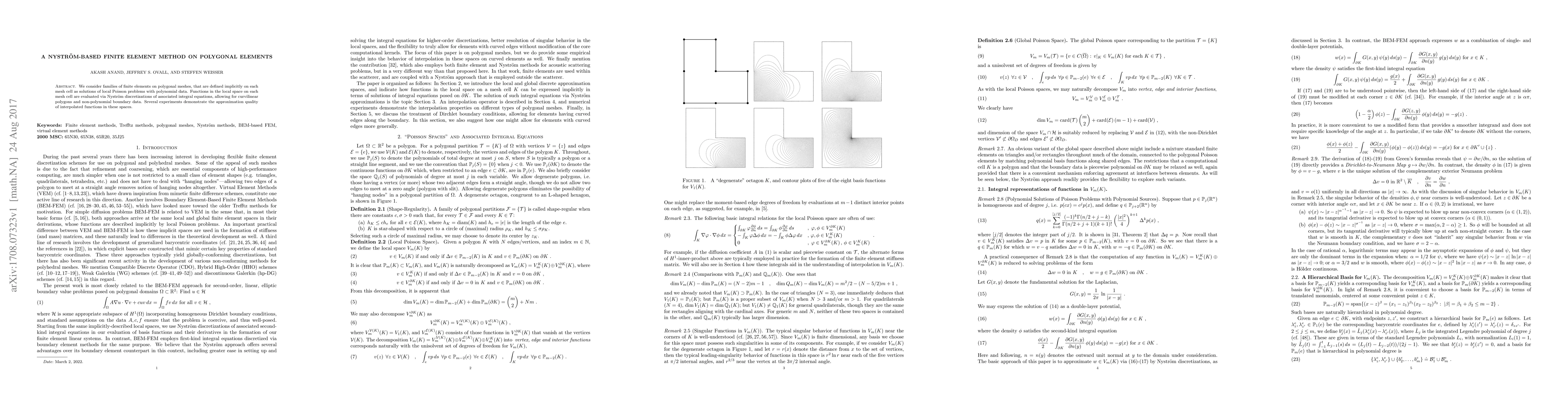 We consider families of finite elements on polygonal meshes, that are defined implicitly on each mesh cell as solutions of local Poisson problems with polynomial data. Functions in the local space on each mesh cell are evaluated via Nystr\"om discretizations of associated integral equations, allowing for curvilinear polygons and non-polynomial boundary data. Several experiments demonstrate the approximation quality of interpolated functions in these spaces.