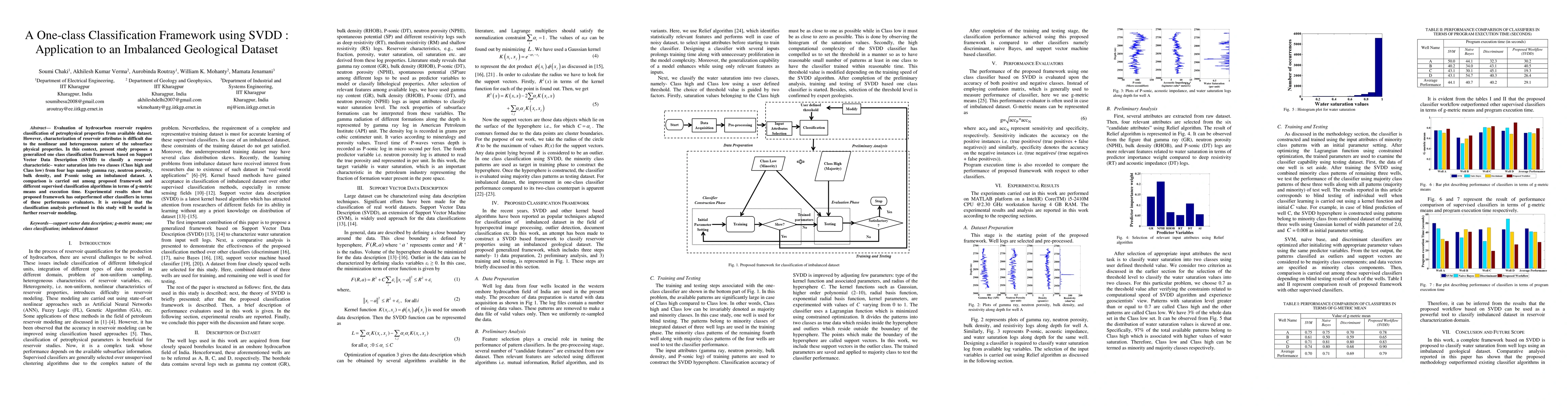 Evaluation of hydrocarbon reservoir requires classification of petrophysical properties from available dataset. However, characterization of reservoir attributes is difficult due to the nonlinear and heterogeneous nature of the subsurface physical properties. In this context, present study proposes a generalized one class classification framework based on Support Vector Data Description (SVDD) to classify a reservoir characteristic water saturation into two classes (Class high and Class low) from four logs namely gamma ray, neutron porosity, bulk density, and P sonic using an imbalanced dataset. A comparison is carried out among proposed framework and different supervised classification algorithms in terms of g metric means and execution time. Experimental results show that proposed framework has outperformed other classifiers in terms of these performance evaluators. It is envisaged that the classification analysis performed in this study will be useful in further reservoir modeling.
