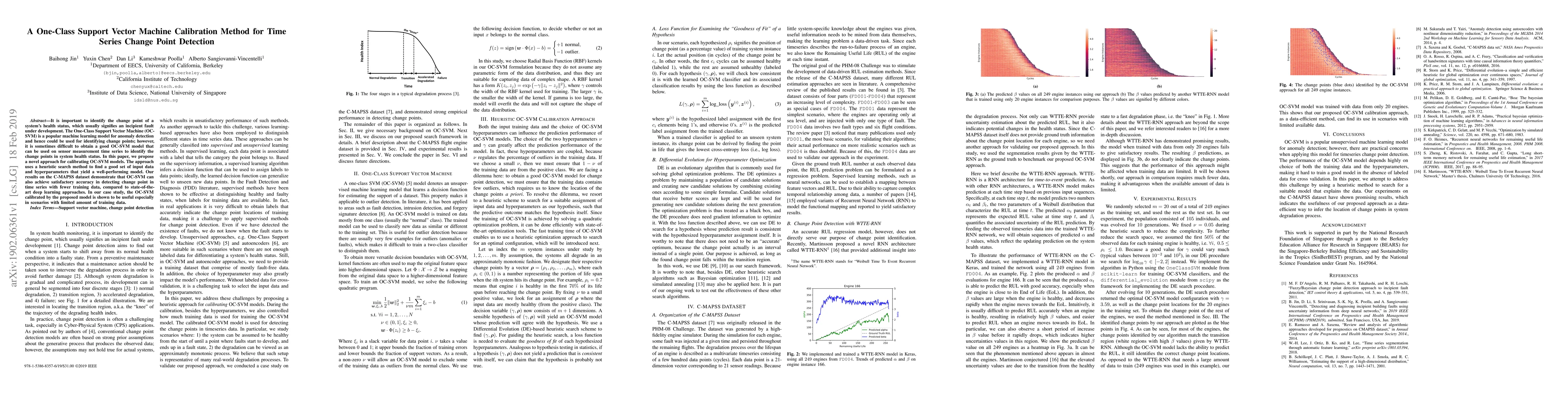 It is important to identify the change point of a system's health status, which usually signifies an incipient fault under development. The One-Class Support Vector Machine (OC-SVM) is a popular machine learning model for anomaly detection and hence could be used for identifying change points; however, it is sometimes difficult to obtain a good OC-SVM model that can be used on sensor measurement time series to identify the change points in system health status. In this paper, we propose a novel approach for calibrating OC-SVM models. The approach uses a heuristic search method to find a good set of input data and hyperparameters that yield a well-performing model. Our results on the C-MAPSS dataset demonstrate that OC-SVM can also achieve satisfactory accuracy in detecting change point in time series with fewer training data, compared to state-of-the-art deep learning approaches. In our case study, the OC-SVM calibrated by the proposed model is shown to be useful especially in scenarios with limited amount of training data.