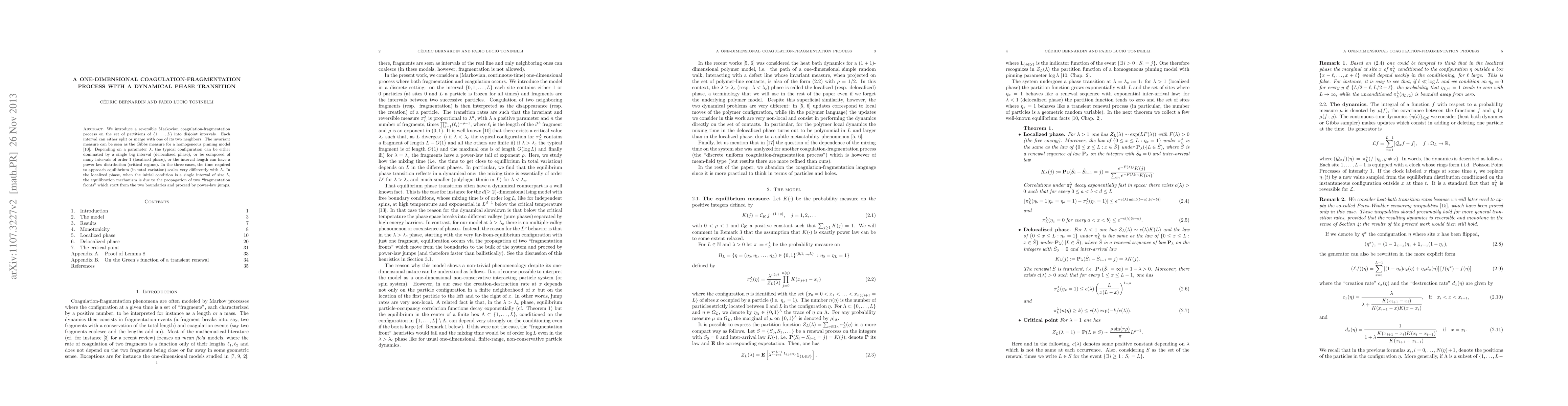 This research introduces a one-dimensional coagulation-fragmentation process on partitions of {1,...,L} with merging and splitting behaviors dependent on a parameter λ. The system exhibits distinct phases – delocalized (single large interval), localized (many small intervals), and critical (power-law interval distribution) – each with varying equilibration times as L grows. In the localized phase, equilibration is driven by fragmentation fronts from boundaries.