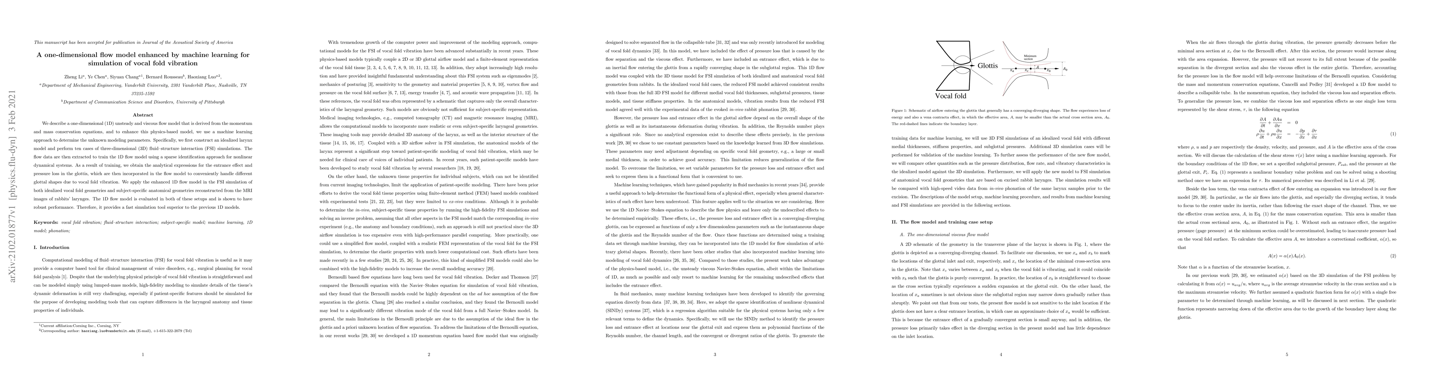 This paper presents a one-dimensional flow model enhanced by machine learning to simulate vocal fold vibration, trained using data from three-dimensional fluid-structure interaction simulations. The enhanced model provides accurate analytical expressions for glottal entrance effects and pressure loss, demonstrating robust performance in both idealized and subject-specific anatomical simulations.
