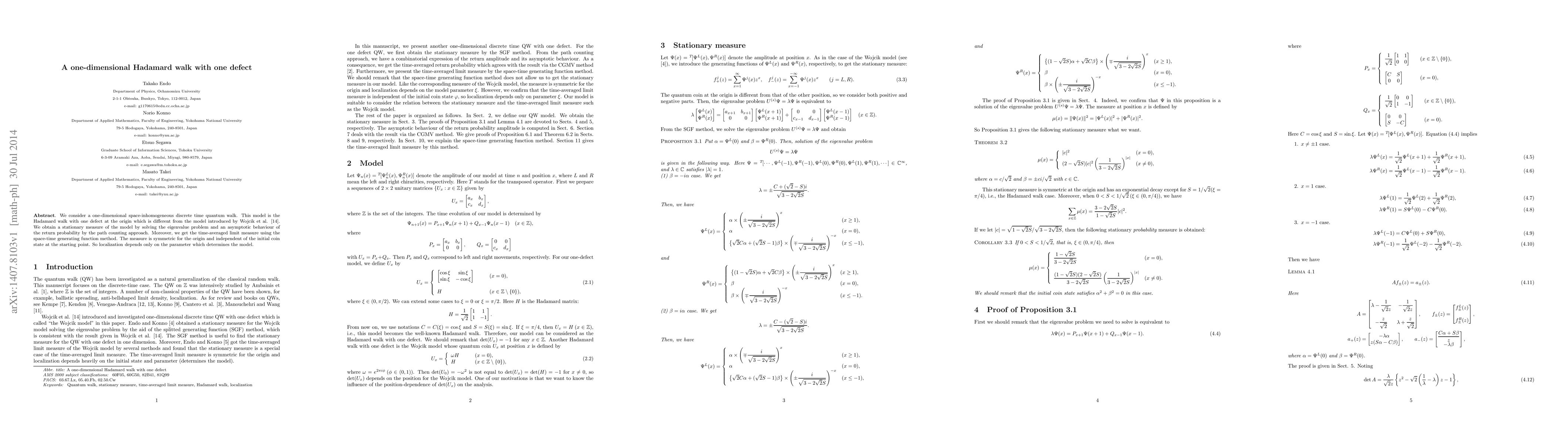We consider a one-dimensional space-inhomogeneous discrete time quantum walk. This model is the Hadamard walk with one defect at the origin which is different from the model introduced by Wojcik et al. [14]. We obtain a stationary measure of the model by solving the eigenvalue problem and an asymptotic behaviour of the return probability by the path counting approach. Moreover, we get the time-averaged limit measure using the space-time generating function method. The measure is symmetric for the origin and independent of the initial coin state at the starting point. So localization depends only on the parameter which determines the model.