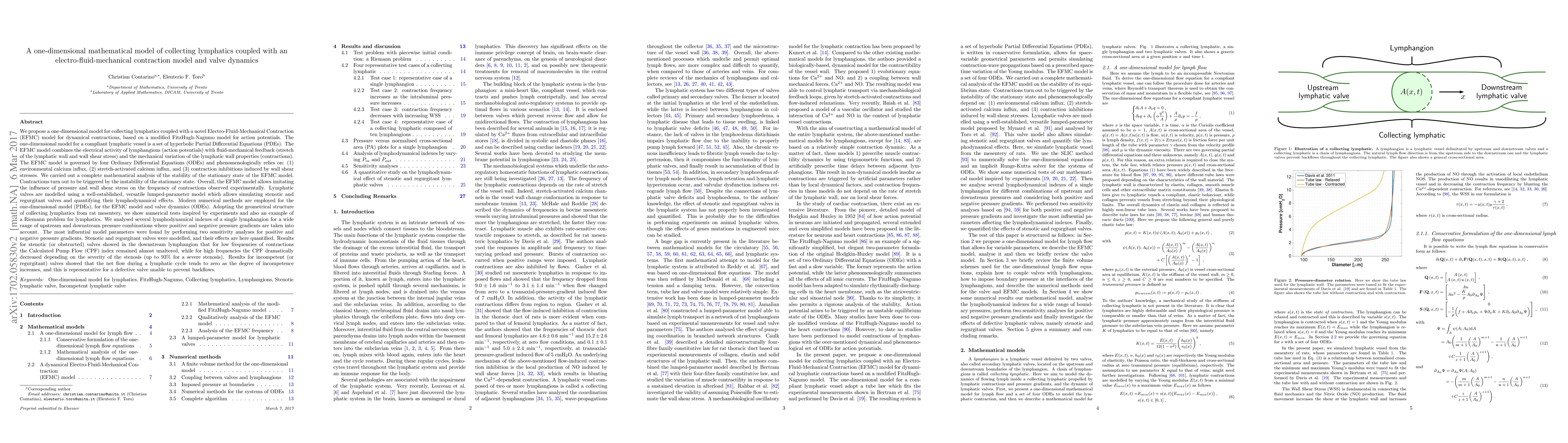 We propose a one-dimensional model for collecting lymphatics coupled with a novel Electro-Fluid-Mechanical Contraction (EFMC) model for dynamical contractions, based on a modified FitzHugh-Nagumo model for action potentials. The one-dimensional model for a compliant lymphatic vessel is a set of hyperbolic Partial Differential Equations (PDEs). The EFMC model combines the electrical activity of lymphangions (action potentials) with fluid-mechanical feedback (stretch of the lymphatic wall and wall shear stress) and the mechanical variation of the lymphatic wall properties (contractions). The EFMC model is governed by four Ordinary Differential Equations (ODEs) and phenomenologically relies on: (1) environmental calcium influx, (2) stretch-activated calcium influx, and (3) contraction inhibitions induced by wall shear stresses. We carried out a complete mathematical analysis of the stability of the stationary state of the EFMC model. Overall, the EFMC model allows imitating the influence of pressure and wall shear stress on the frequency of contractions observed experimentally. Lymphatic valves are modelled using a well-established lumped-parameter model which allows simulating stenotic and regurgitant valves. We analysed several lymphodynamical indexes of a single lymphangion for a wide range of upstream and downstream pressure combinations. Stenotic and regurgitant valves were modelled, and their effects are here quantified. Results for stenotic valves showed in the downstream lymphangion that for low frequencies of contractions the Calculated Pump Flow (CPF) index remained almost unaltered, while for high frequencies the CPF dramatically decreased depending on the severity of the stenosis (up to 93% for a severe stenosis). Results for incompetent valves showed that the net flow during a lymphatic cycle tends to zero as the degree of incompetence increases.