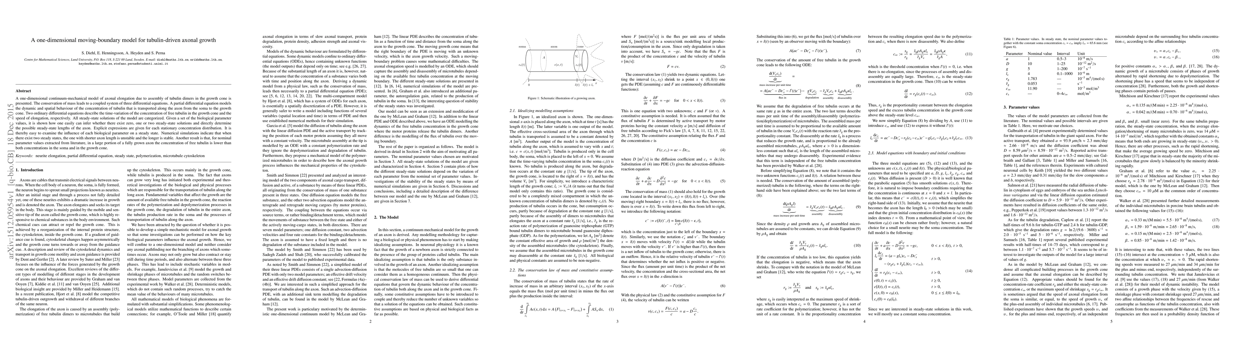 This paper presents a one-dimensional model explaining axonal growth driven by tubulin assembly, categorizing steady-state solutions based on biological parameters. It reveals that, for given parameters, axons stabilize at specific lengths, and numerical simulations show the instability of shorter steady states compared to longer ones. The research also indicates that free tubulin concentration in much of a mature axon is lower than in both the soma and growth cone.
