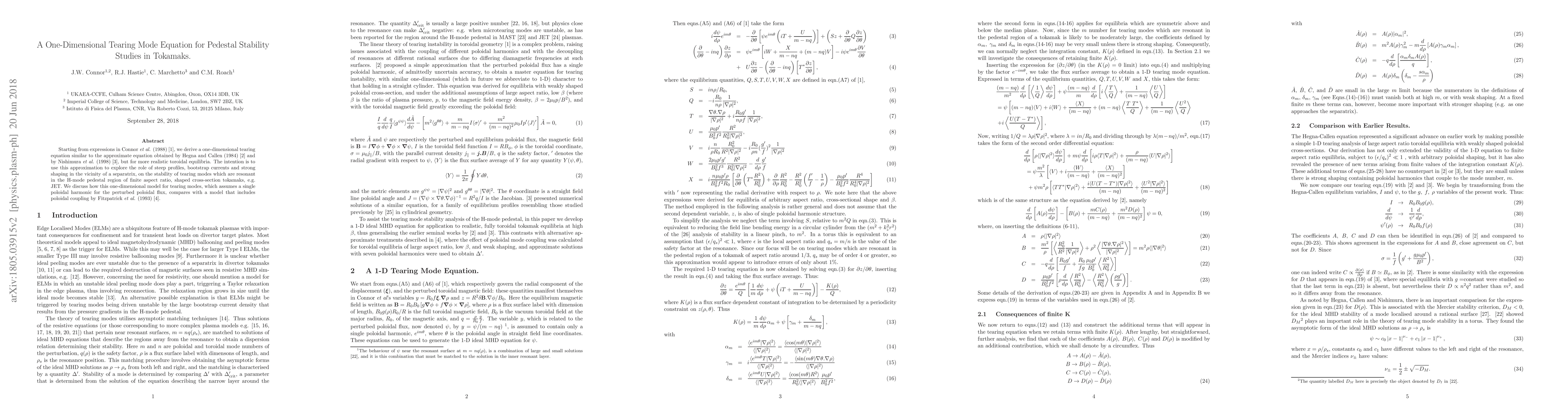 Starting from expressions in Connor et al. (1988) [1], we derive a one-dimensional tearing equation similar to the approximate equation obtained by Hegna and Callen (1984) [2] and by Nishimura et al (1998) [3], but for more realistic toroidal equilibria. The intention is to use this approximation to explore the role of steep profiles, bootstrap currents and strong shaping in the vicinity of a separatrix, on the stability of tearing modes which are resonant in the H-mode pedestal region of finite aspect ratio, shaped cross-section tokamaks, e.g. JET. We discuss how this one-dimensional model for tearing modes, which assumes a single poloidal harmonic for the perturbed poloidal flux, compares with a model that includes poloidal coupling by Fitzpatrick et al (1993) [4].