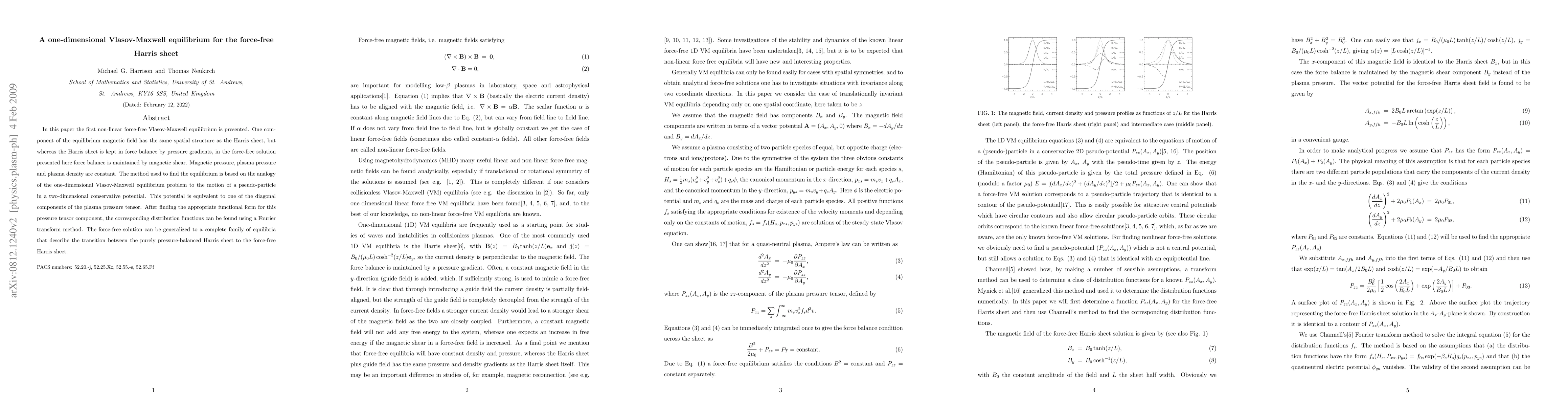 This paper presents the first non-linear force-free Vlasov-Maxwell equilibrium, where force balance is maintained by magnetic shear instead of pressure gradients. The method employs a pseudo-particle analogy and a Fourier transform to derive the equilibrium, generalizing it to describe transitions between pressure-balanced and force-free Harris sheets.