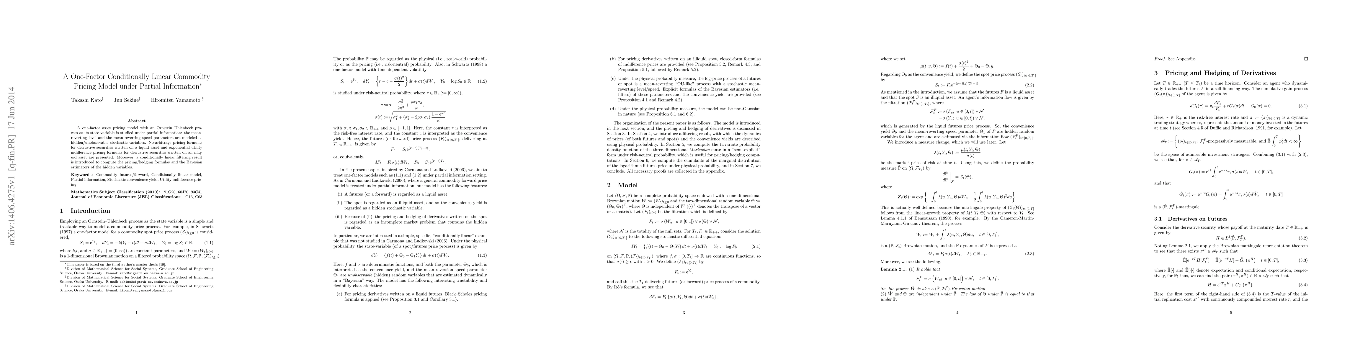 This paper develops a one-factor asset pricing model with hidden parameters modeled as stochastic variables under partial information. It presents no-arbitrage pricing and utility indifference pricing formulas for derivatives, along with a conditionally linear filtering result for computing pricing/hedging formulas and Bayesian estimators.