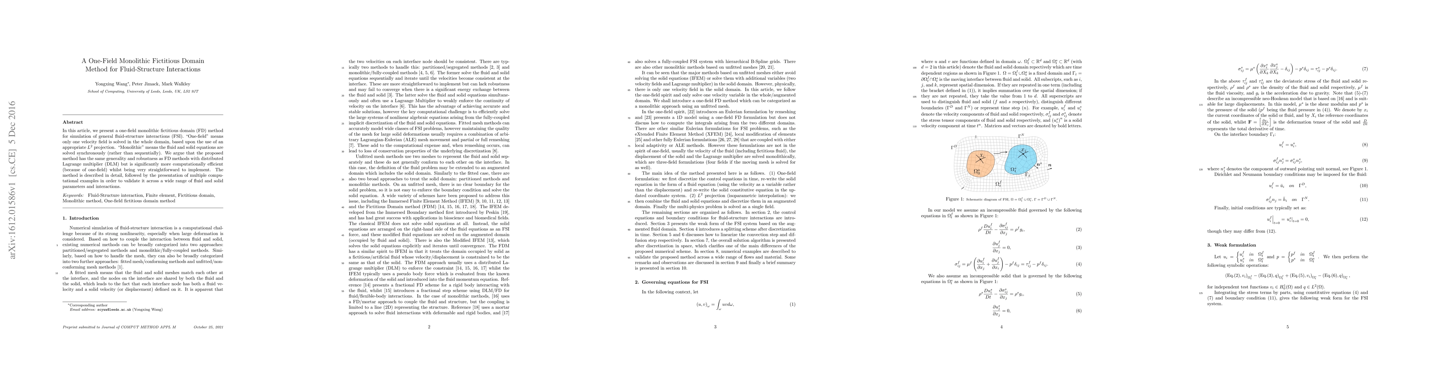 This paper introduces a one-field monolithic fictitious domain method for fluid-structure interactions, solving fluid and solid equations synchronously with a single velocity field, claiming enhanced computational efficiency and straightforward implementation compared to distributed Lagrange multiplier methods. Computational examples validate the method's robustness across various FSI scenarios.