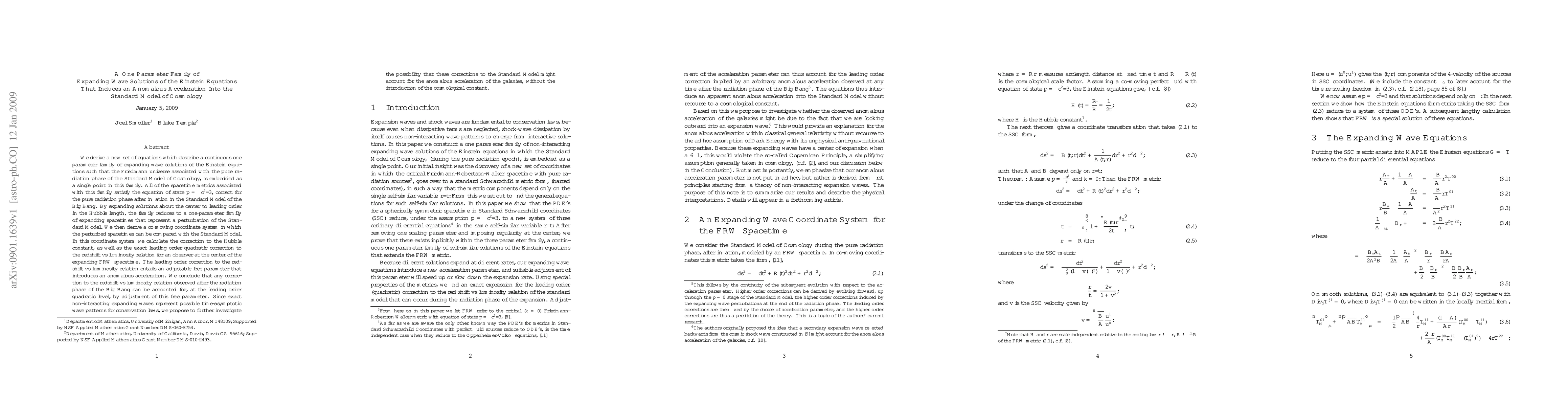 We derive a new set of equations which describe a continuous one parameter family of expanding wave solutions of the Einstein equations such that the Friedmann universe associated with the pure radiation phase of the Standard Model of Cosmology, is embedded as a single point in this family. All of the spacetime metrics associated with this family satisfy the equation of state $p=\rho c^2/3$, correct for the pure radiation phase after inflation in the Standard Model of the Big Bang. By expanding solutions about the center to leading order in the Hubble length, the family reduces to a one-parameter family of expanding spacetimes that represent a perturbation of the Standard Model. We then derive a co-moving coordinate system in which the perturbed spacetimes can be compared with the Standard Model. In this coordinate system we calculate the correction to the Hubble constant, as well as the exact leading order quadratic correction to the redshift vs luminosity relation for an observer at the center of the expanding FRW spacetime. The leading order correction to the redshift vs luminosity relation entails an adjustable free parameter that introduces an anomalous acceleration. We conclude that any correction to the redshift vs luminosity relation observed after the radiation phase of the Big Bang can be accounted for, at the leading order quadratic level, by adjustment of this free parameter. Since exact non-interacting expanding waves represent possible time-asymptotic wave patterns for conservation laws, we propose to further investigate the possibility that these corrections to the Standard Model might account for the anomalous acceleration of the galaxies, without the introduction of the cosmological constant.