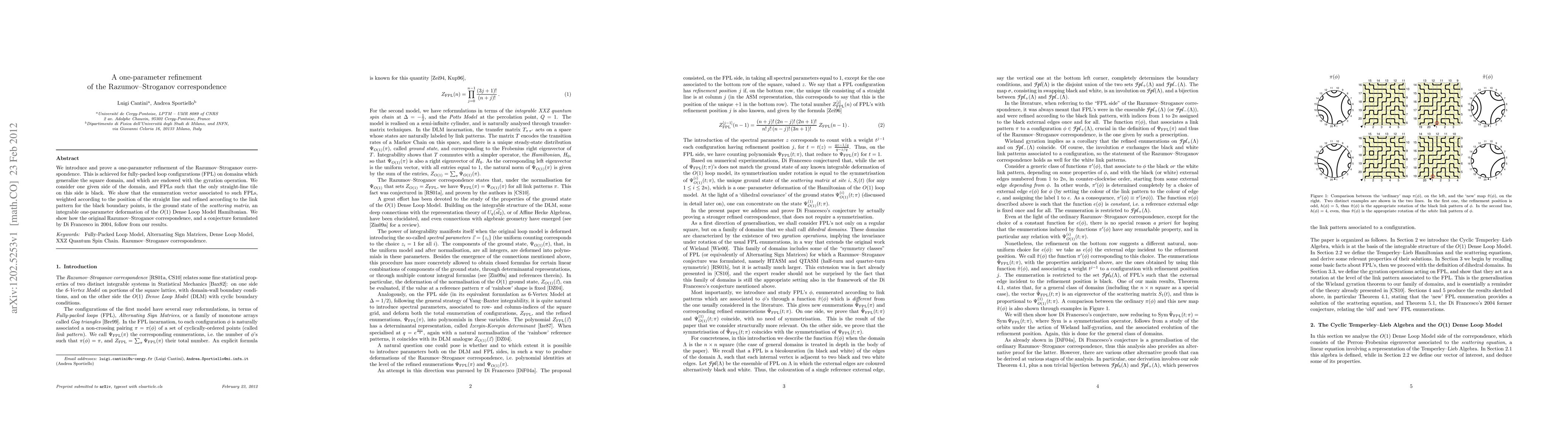The research introduces and proves a one-parameter refinement of the Razumov-Stroganov correspondence for fully-packed loop configurations (FPL) on generalized square domains using the gyration operation, demonstrating its connection to the scattering matrix of an integrable one-parameter deformation of the O(1) Dense Loop Model Hamiltonian.