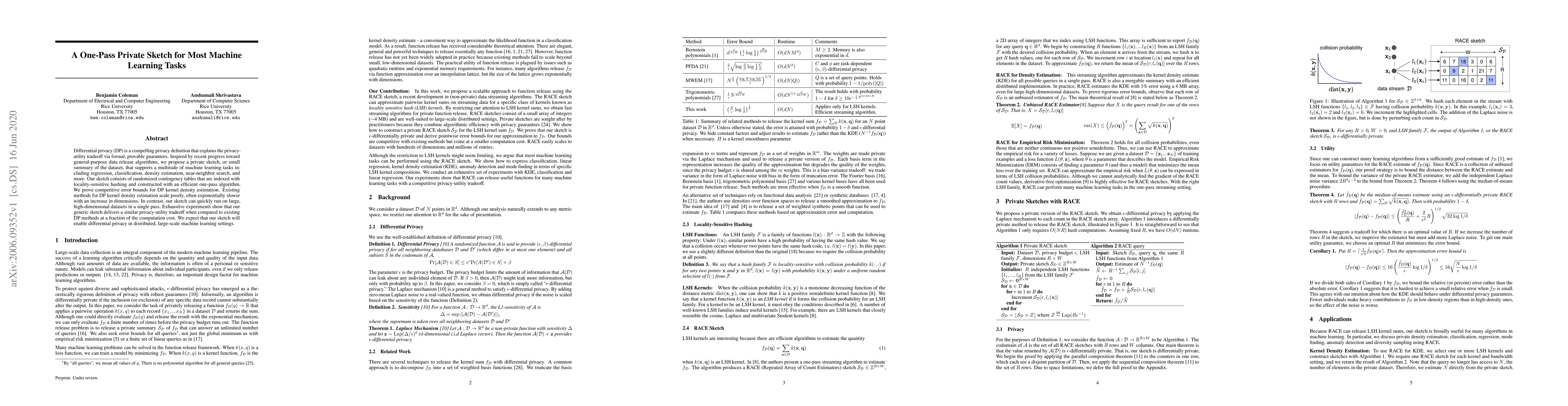 Differential privacy (DP) is a compelling privacy definition that explains the privacy-utility tradeoff via formal, provable guarantees. Inspired by recent progress toward general-purpose data release algorithms, we propose a private sketch, or small summary of the dataset, that supports a multitude of machine learning tasks including regression, classification, density estimation, near-neighbor search, and more. Our sketch consists of randomized contingency tables that are indexed with locality-sensitive hashing and constructed with an efficient one-pass algorithm. We prove competitive error bounds for DP kernel density estimation. Existing methods for DP kernel density estimation scale poorly, often exponentially slower with an increase in dimensions. In contrast, our sketch can quickly run on large, high-dimensional datasets in a single pass. Exhaustive experiments show that our generic sketch delivers a similar privacy-utility tradeoff when compared to existing DP methods at a fraction of the computation cost. We expect that our sketch will enable differential privacy in distributed, large-scale machine learning settings.