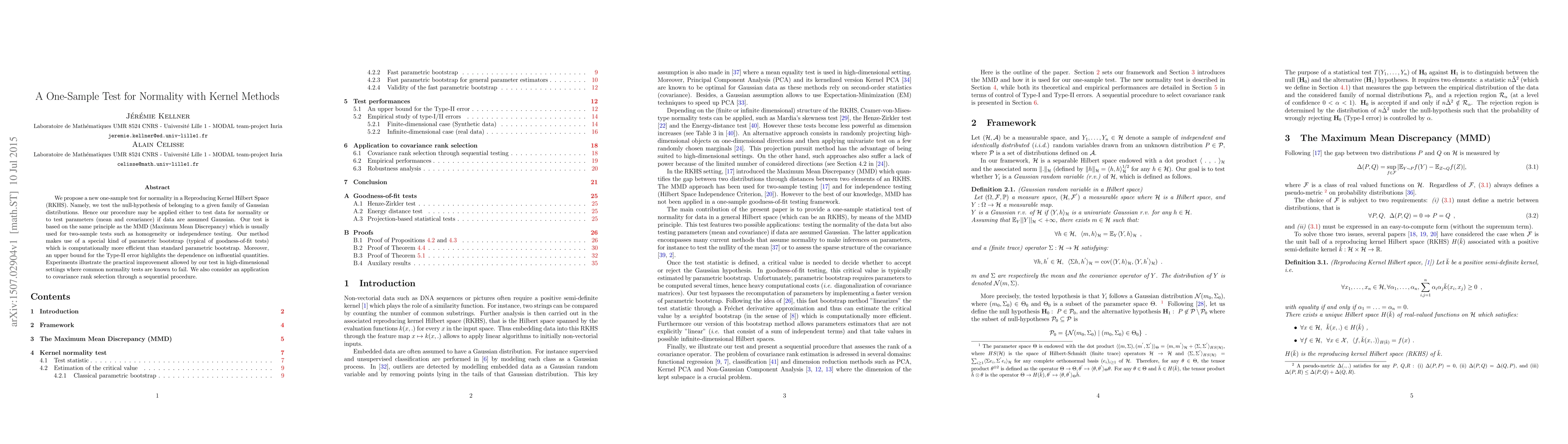 This paper introduces a novel one-sample test for normality in Reproducing Kernel Hilbert Space, based on the MMD principle, employing a more efficient parametric bootstrap. The method shows practical improvements in high-dimensional settings, and it also applies to covariance rank selection.