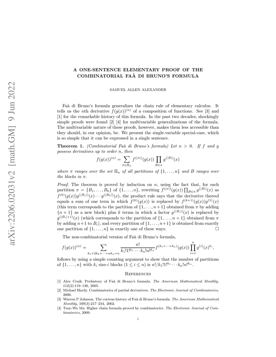 We give a one-sentence elementary proof of the combinatorial Fa\`a di Bruno's formula.