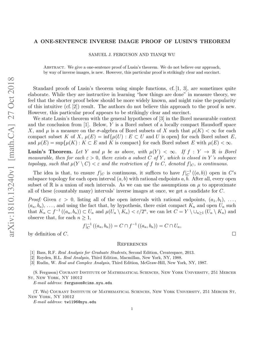 This paper presents a concise one-sentence proof of Lusin's theorem using inverse images, aiming to provide a clearer and more succinct alternative to traditional methods. The authors emphasize the simplicity of their approach despite not claiming novelty in the technique.