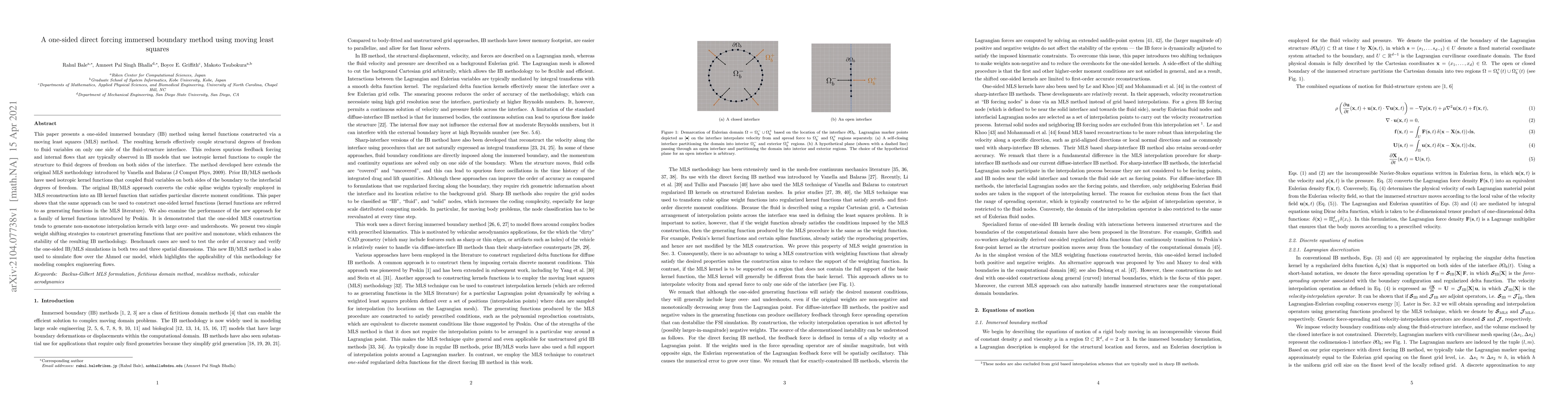 This paper presents a one-sided immersed boundary (IB) method using kernel functions constructed via a moving least squares (MLS) method. The resulting kernels effectively couple structural degrees of freedom to fluid variables on only one side of the fluid-structure interface. This reduces spurious feedback forcing and internal flows that are typically observed in IB models that use isotropic kernel functions to couple the structure to fluid degrees of freedom on both sides of the interface. The method developed here extends the original MLS methodology introduced by Vanella and Balaras (J Comput Phys, 2009). Prior IB/MLS methods have used isotropic kernel functions that coupled fluid variables on both sides of the boundary to the interfacial degrees of freedom. The original IB/MLS approach converts the cubic spline weights typically employed in MLS reconstruction into an IB kernel function that satisfies particular discrete moment conditions. This paper shows that the same approach can be used to construct one-sided kernel functions (kernel functions are referred to as generating functions in the MLS literature). We also examine the performance of the new approach for a family of kernel functions introduced by Peskin. It is demonstrated that the one-sided MLS construction tends to generate non-monotone interpolation kernels with large over- and undershoots. We present two simple weight shifting strategies to construct generating functions that are positive and monotone, which enhances the stability of the resulting IB methodology. Benchmark cases are used to test the order of accuracy and verify the one-sided IB/MLS simulations in both two and three spatial dimensions. This new IB/MLS method is also used to simulate flow over the Ahmed car model, which highlights the applicability of this methodology for modeling complex engineering flows.