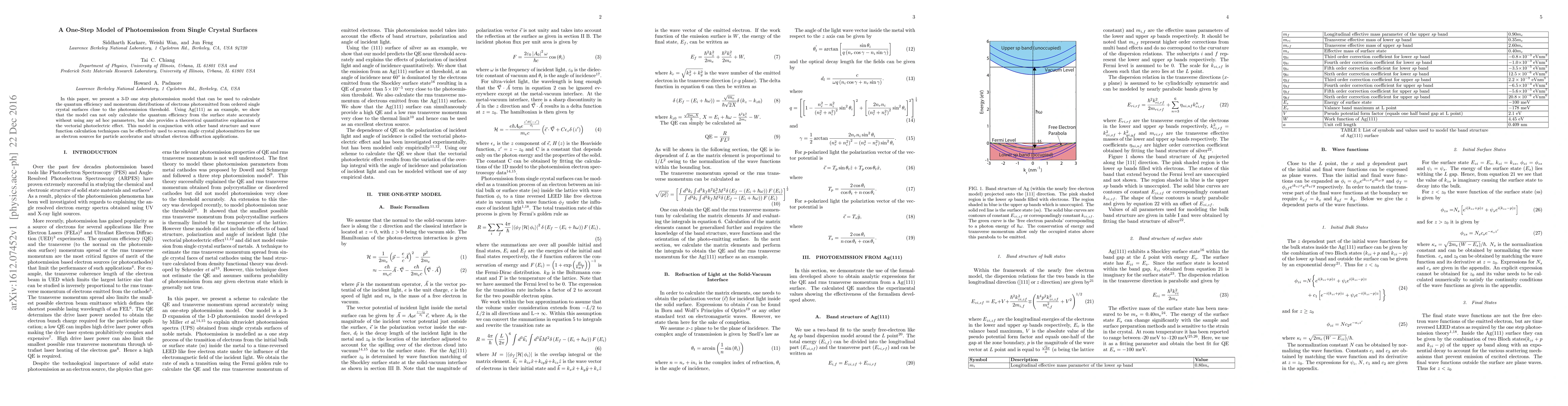 In this paper, we present a 3-D one step photoemission model that can be used to calculate the quantum efficiency and momentum distributions of electrons photoemitted from ordered single crystal surfaces close to the photoemission threshold. Using Ag(111) as an example, we show that the model can not only calculate the quantum efficiency from the surface state accurately without using any ad hoc parameters, but also provides a theoretical quantitative explanation of the vectorial photoelectric effect. This model in conjunction with other band structure and wave function calculation techniques can be effectively used to screen single crystal photoemitters for use as electron sources for particle accelerator and ultrafast electron diffraction applications.