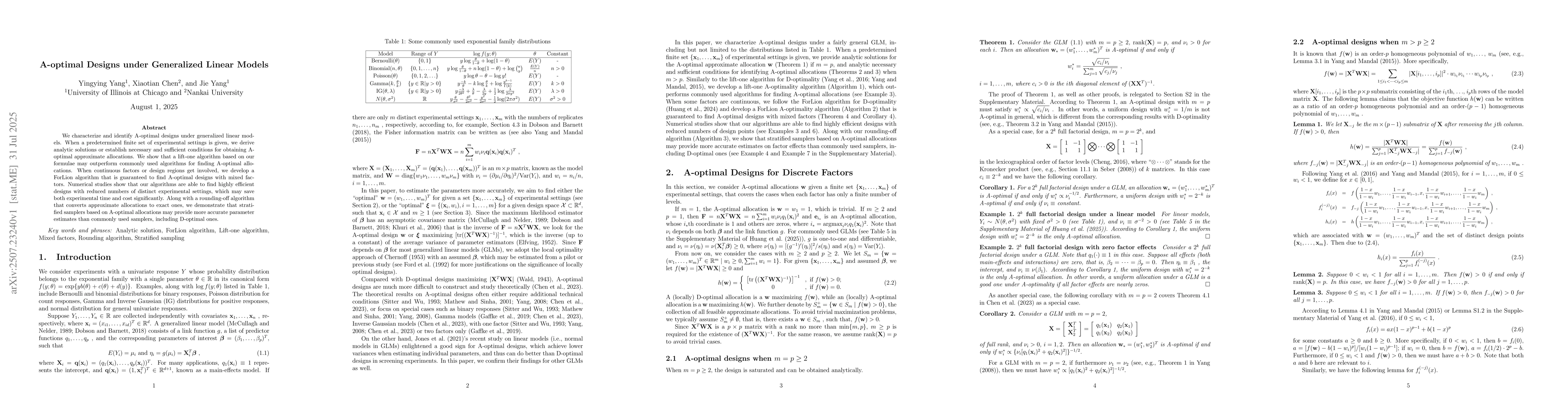 We characterize and identify A-optimal designs under generalized linear models. When a predetermined finite set of experimental settings is given, we derive analytic solutions or establish necessary and sufficient conditions for obtaining A-optimal approximate allocations. We show that a lift-one algorithm based on our formulae may outperform commonly used algorithms for finding A-optimal allocations. When continuous factors or design regions get involved, we develop a ForLion algorithm that is guaranteed to find A-optimal designs with mixed factors. Numerical studies show that our algorithms are able to find highly efficient designs with reduced numbers of distinct experimental settings, which may save both experimental time and cost significantly. Along with a rounding-off algorithm that converts approximate allocations to exact ones, we demonstrate that stratified samplers based on A-optimal allocations may provide more accurate parameter estimates than commonly used samplers, including D-optimal ones.