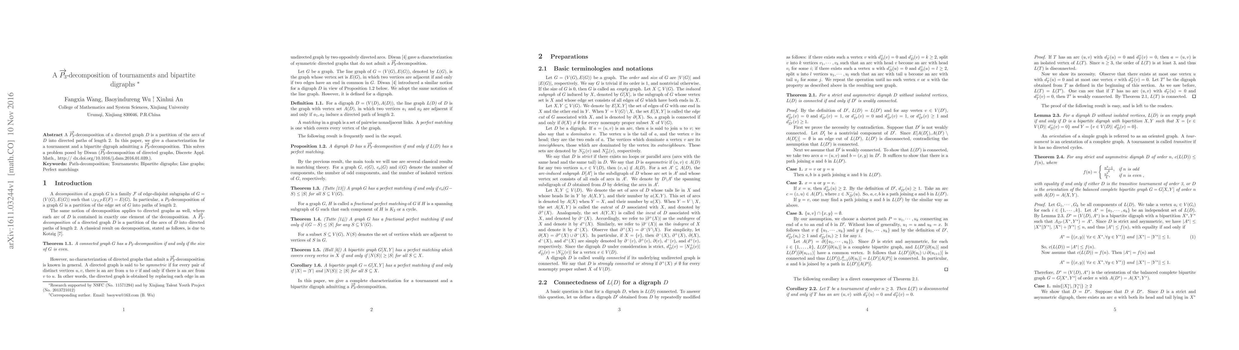 This paper characterizes conditions under which tournaments and bipartite digraphs can be decomposed into directed paths of length 2, solving a problem posed by Diwan regarding $\overrightarrow{P_{3}}$-decompositions of directed graphs.