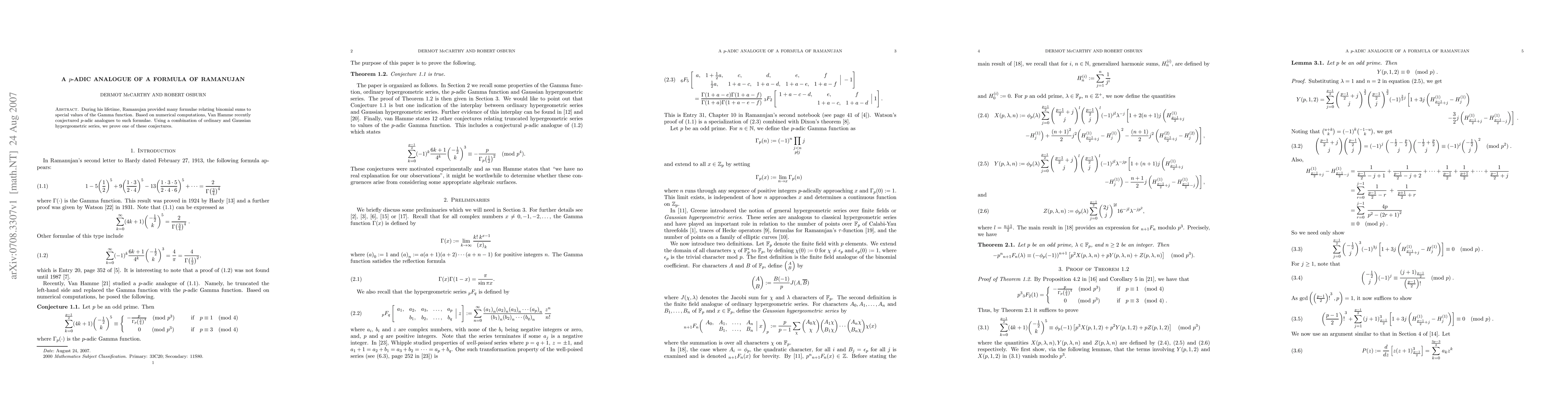 Summary: This paper proves a $p$-adic analogue of a Ramanujan formula relating binomial sums to special values of the Gamma function. The proof utilizes ordinary and Gaussian hypergeometric series.